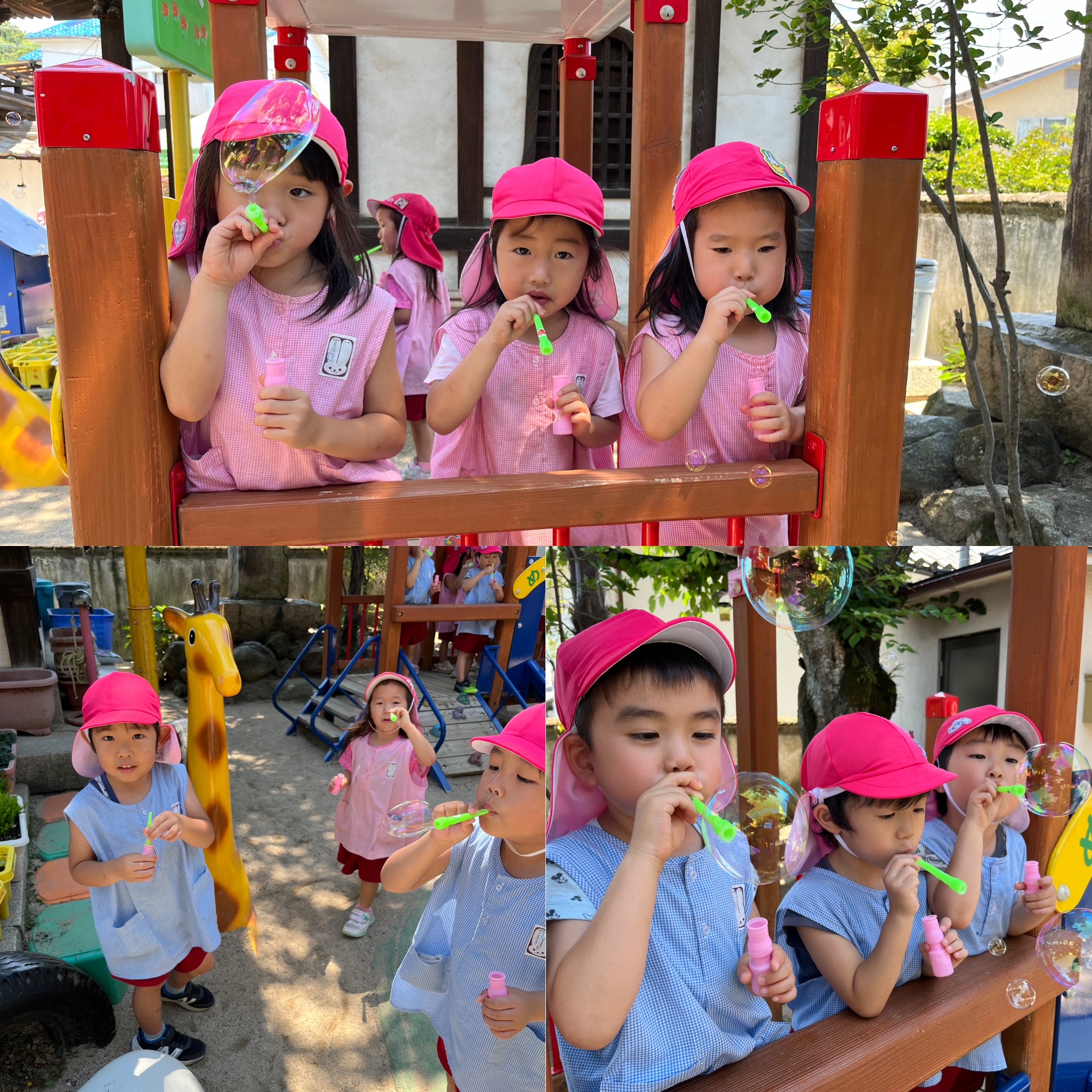 しゃぼん玉あそび。ゆっくり吹くと大きなしゃぼん玉ができることを知って、挑戦してます!