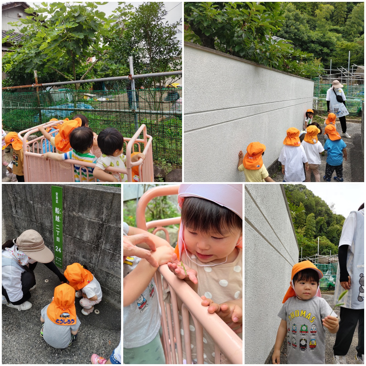 園付近のお散歩に出かけました。 狭い道もあるので、そこでは自然の発見がたくさんあります。 畑から、声をかけてくれるおじいちゃん、おばあちゃんとのふれあいも嬉しいですね。