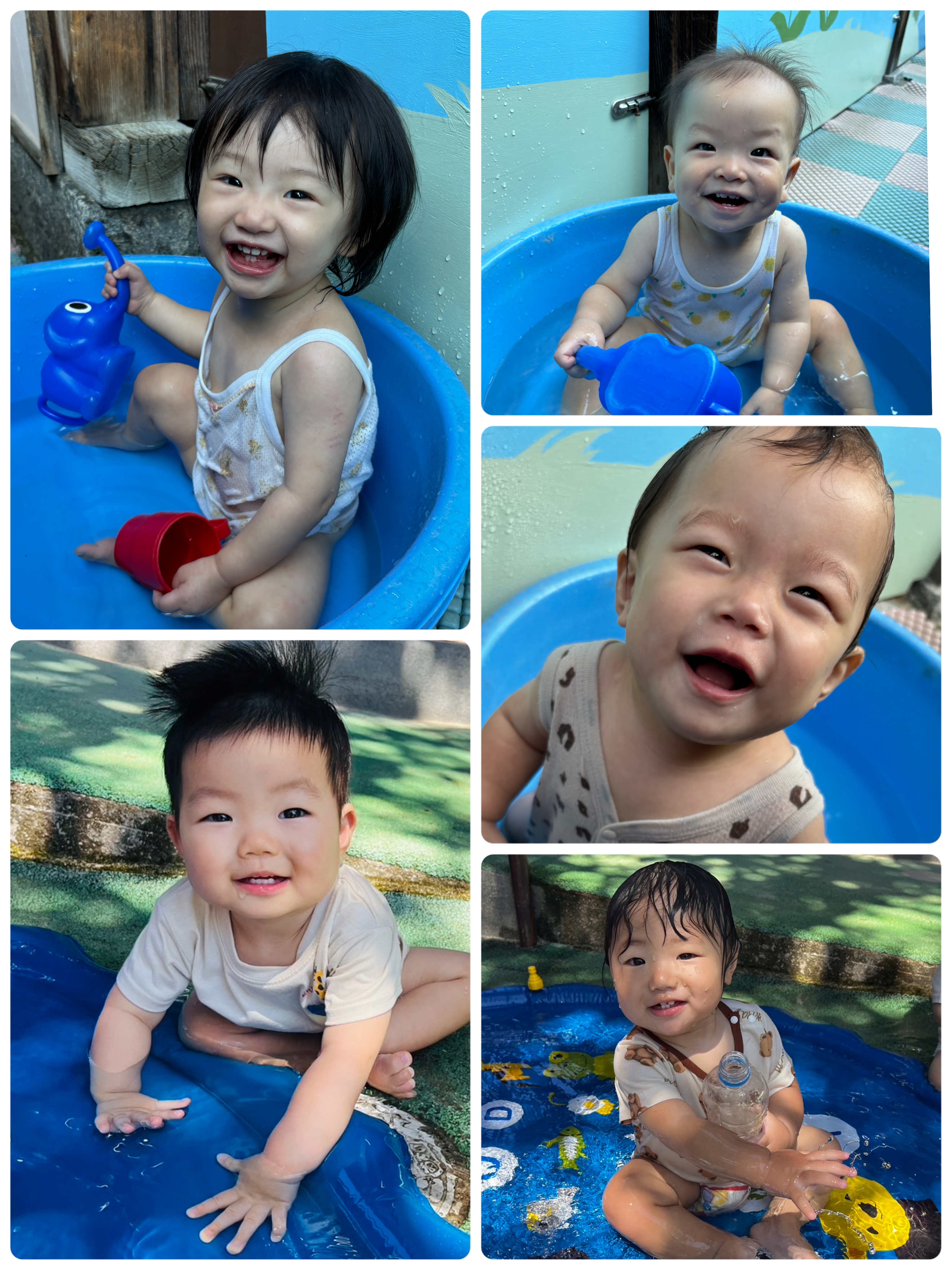 その日の体調に合わせて水遊び♪ 今日はタライチームとビニールプールチームに分かれて遊びました!どちらも笑顔いっぱいです(^o^)