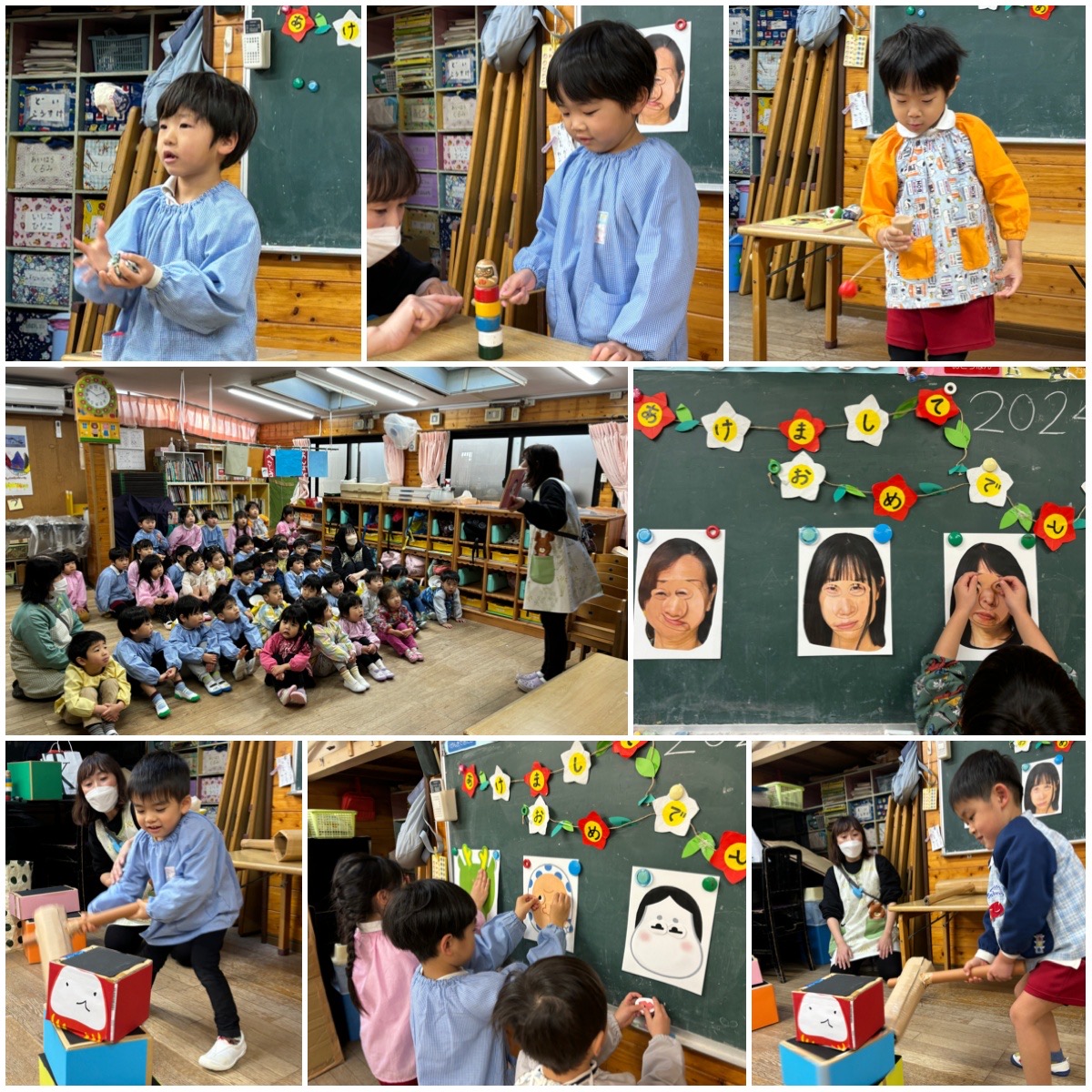 楽しいお正月休み明けからの、友達に会えた嬉しさから賑やかな会になりました。 やったことのあるあそびから初めて見たあそびなど、たくさん楽しみました。 担任福笑いには大爆笑でしたよ。 やってくれたお友達ありがとう笑。