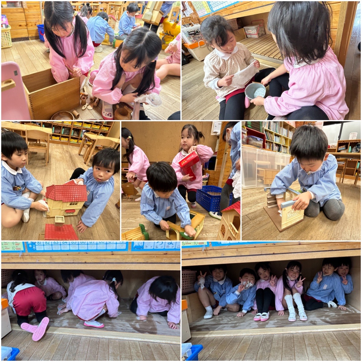 今日は大掃除です。たくさん遊んだ玩具をきれいに拭いてくれました。玩具が入っていた押入れから玩具を全部出して、中もお掃除です。秘密基地みたいで、キャーキャー楽しそうでした!