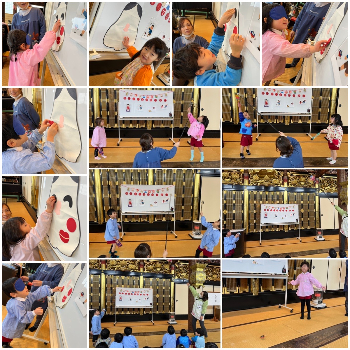 明けましておめでとうございます!まだお休みの子もいましたが、幼児クラスさんは今年も本堂に集まり元気な顔を見せてくれました。新年のご挨拶から始まり、お節料理や門松、鏡餅などのお話を聞いた後は楽しいお正月のあそびで盛り上がりました。遊び方のお手本を見て各クラスでも十分楽しんだようです。今年もよろしくお願いします!