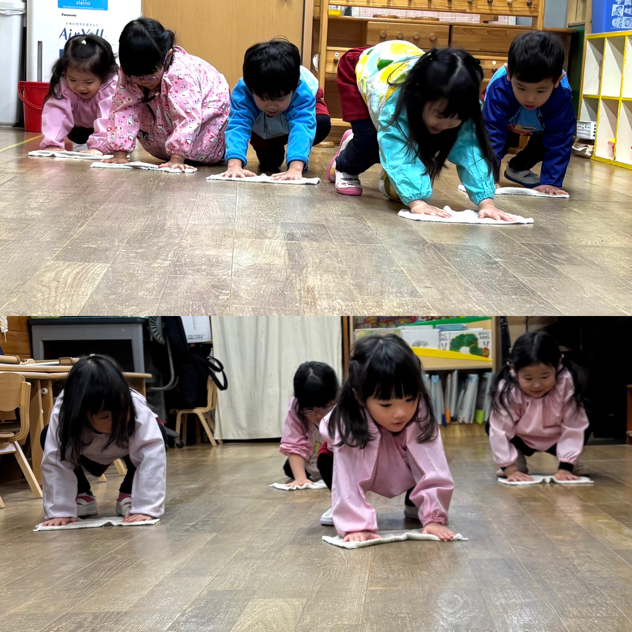 今日からお部屋の雑巾掛けをはじめました。これから雑巾の絞り方なども少しずつ練習していきます。お昼寝がなくなり眠い時間ですが、その時間を使い足腰の体幹も強くしていけたらいいなと思っています!