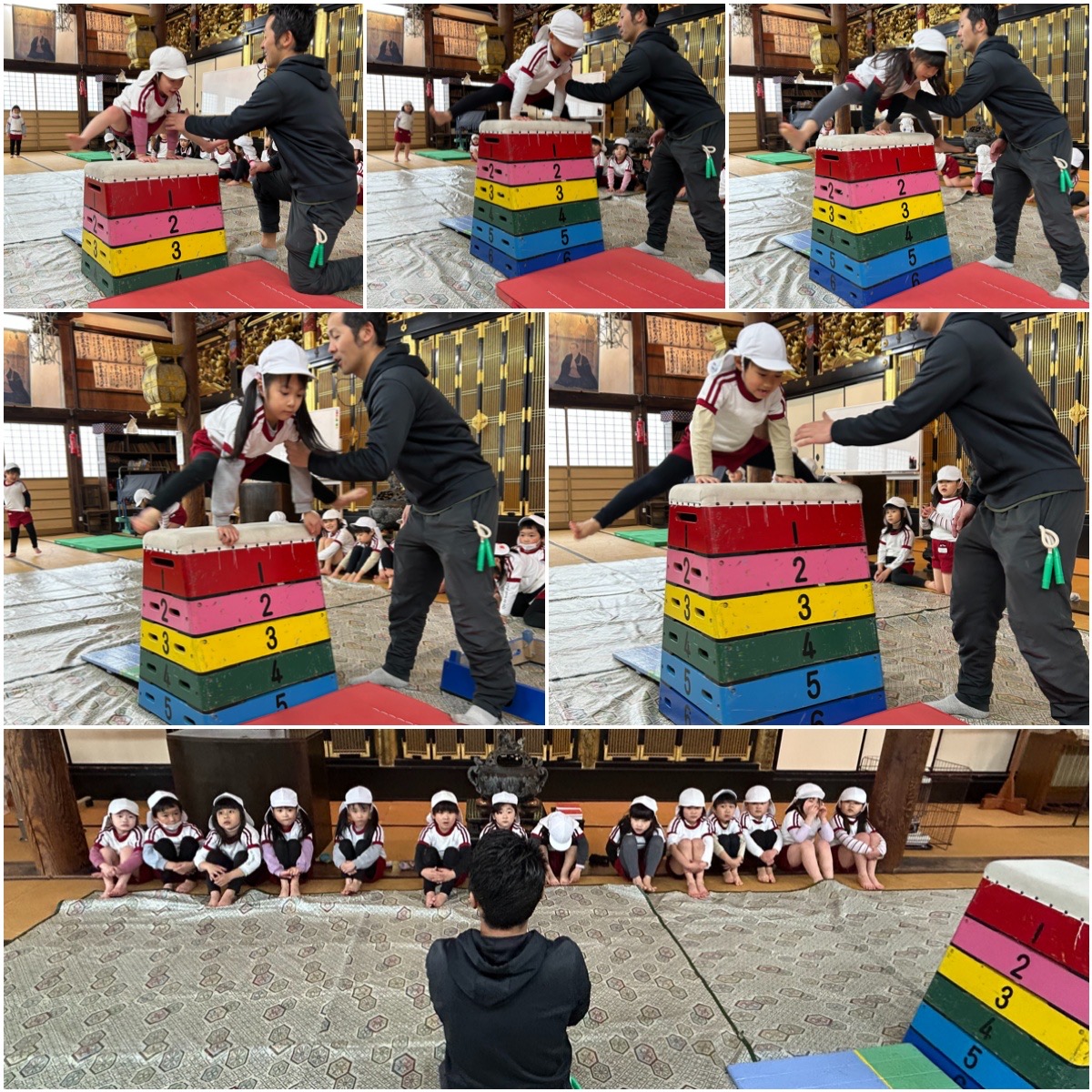 体育指導も次が最後です。今日は雨の為、室内での運転あそびです。子どもたちから『跳び箱がやりたい!』とリクエストがありました。思いきりの良い助走で、4段からどんどん、5段、6段と挑戦していました!やってみようとする姿に、『頑張れー』『おしい!』『すごい!』と子どもたち同士の応援の声が自然と歓声になっていました。