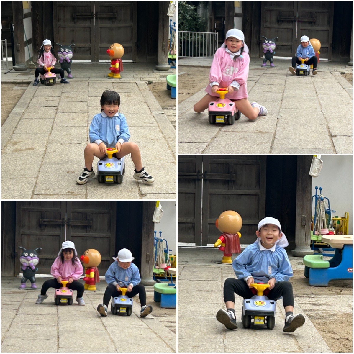 園庭あそびの締めくくりは簡単なゲームです。今日は2チームに分かれて車競争!白組さんが乗ると車がとっても小さく見えますね♪体が大きく成長した証です⭐︎