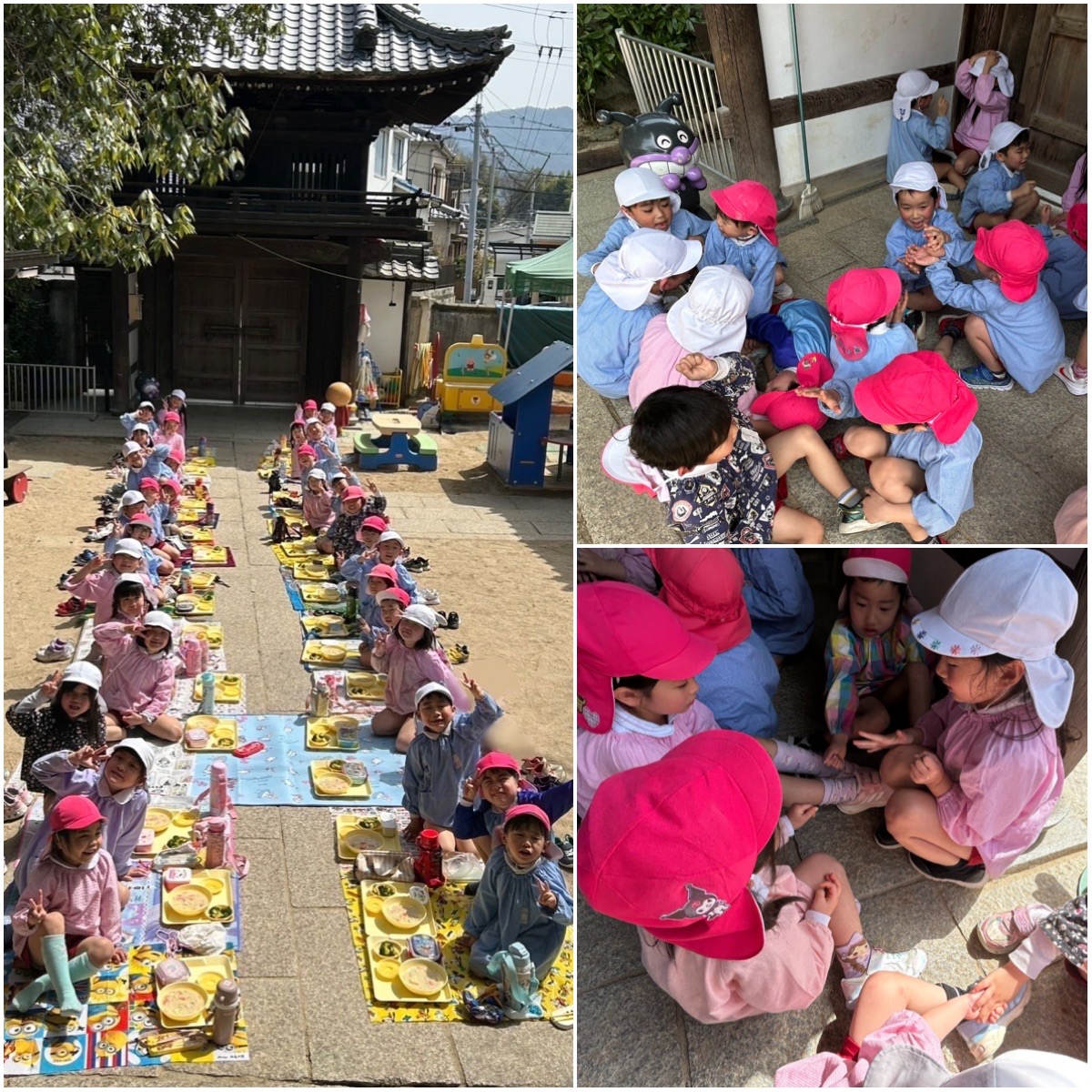 日差しが眩しいほどのいいお天気!ずっと約束していた白組、桃組でのピクニックごっこが今日実現できました。『一緒に座ろ〜』と白組さんが桃組さんに声をかけてくれていました。あまりに暑かったので、食べたら日陰でひと休み。ここでも白組さんと桃組さんの自然な関わりが見られ、じゃんけんで盛り上がっていましたよ。