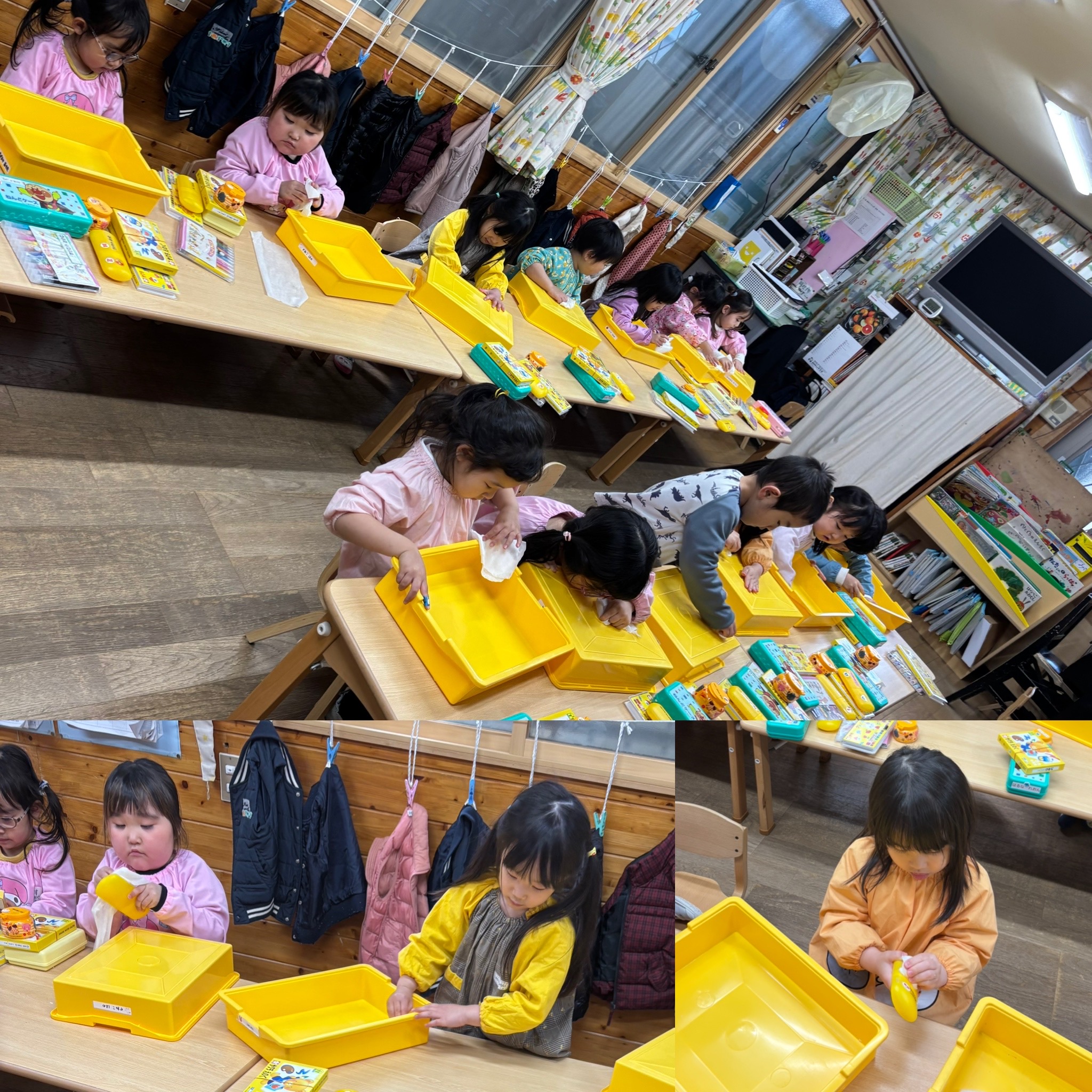 進級まであと数日。。今日はみんなでお道具箱をピカピカにお掃除しました!綺麗になったお道具箱に新しい粘土と絵の具が加わり進級への期待もマックスの子どもたちです!!
