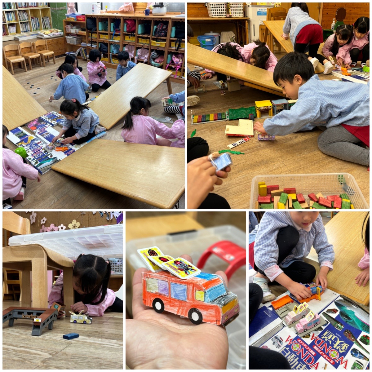 製作が付いてあるチラシをもらいました。持って帰るつもりでしたが、「作る?」と聞いたら目をキラキラさせて「作る!やりたい!」と即答。あっという間に作りあげるとあそびに広がりました。机で滑り台作る!街作る!駐車場作る! 楽しい時間になりました。