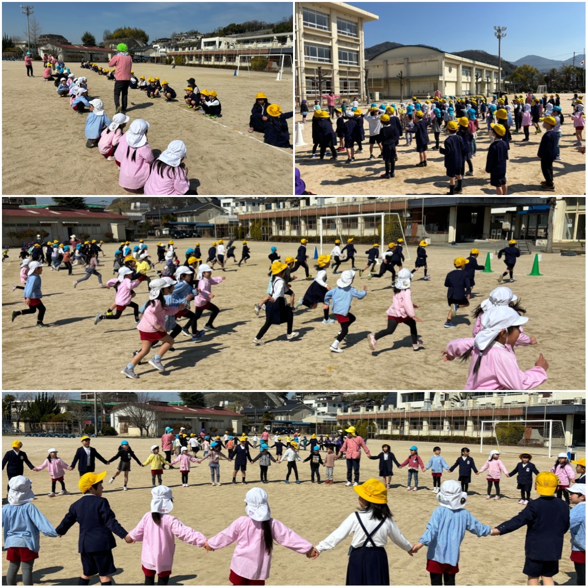 船越小の1年生に、2回目のお誘いを受けあそびに行きました。今回は校庭で体操をしたりゲームをしました。広くて広くてどこまでも走りたい白組さんでした。 もうすぐ1年生になる心の準備は整っているようです!