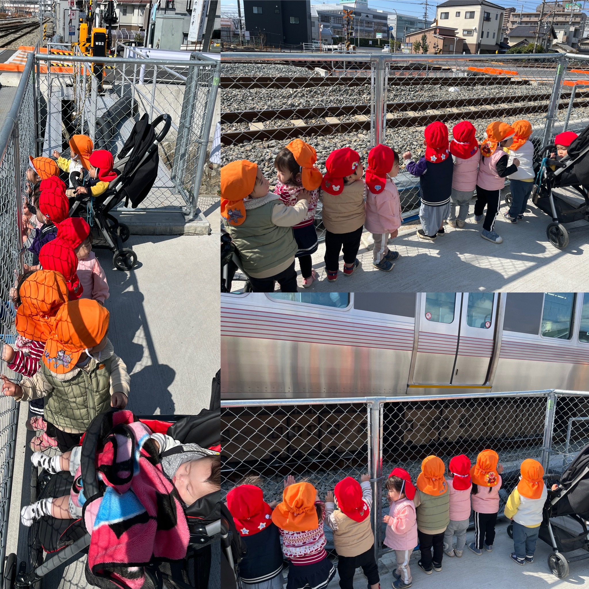 電車を見に入川の踏切までお散歩へ行きました!フェンスにしがみつき可愛い後ろ姿です。目の前を電車が通り、迫力にビックリしていた子どもたちでした。
