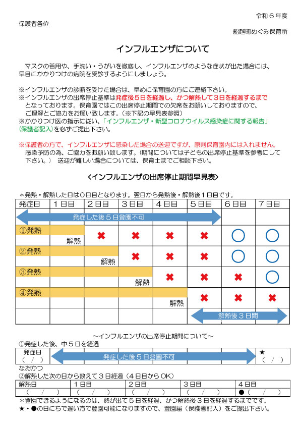 ※インフルエンザの出席停止基準は発症後5日を経過し、かつ解熱して3日を経過するまでとなっております。保育園ではこの出席停止期間での欠席をお願いしておりますので、 ご理解とご協力をお願い致します。(※下記の早見表参照)