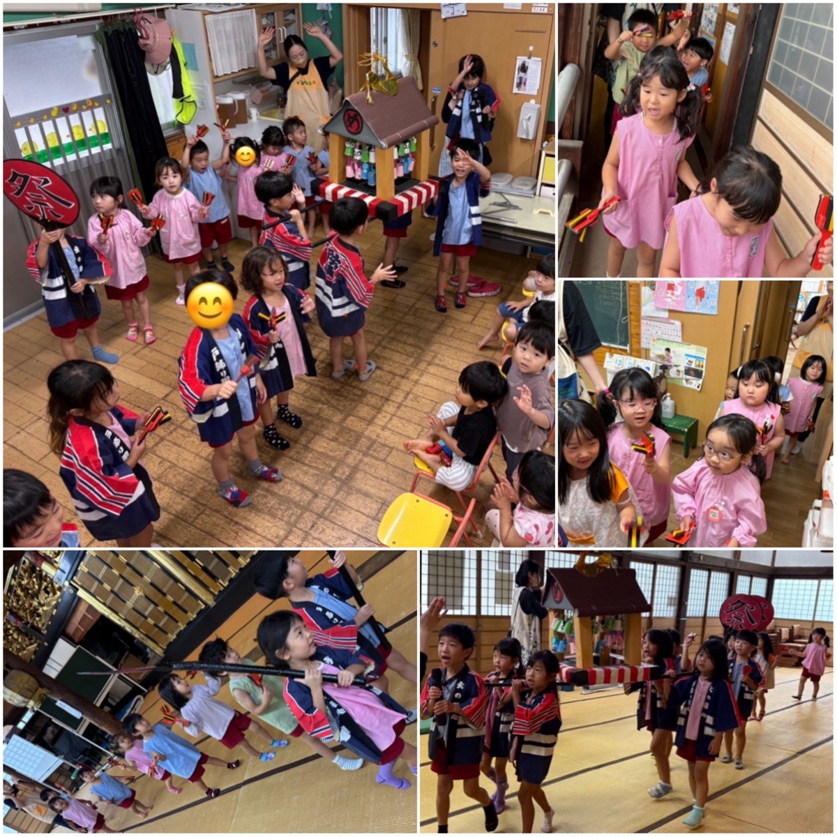 町内を元気に歩くぞ〜!と楽しみにしていたお祭りごっこですが、生憎の雨…。保育園内をぐるり。白組さんがお神輿を担いで『わっしょい!わっしょい!』とみんなの元気なかけ声や、桃組さん黄組さんのにぎやかな鳴子の音とともにまわりましたよ。ひよこ組さんやたまご組さんが迎えてくれました!