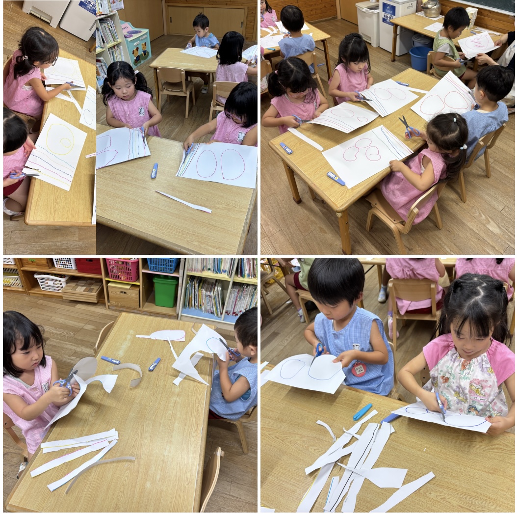 用意された線の上を切る練習から、今日は自分で描いた線の上を切ってみよう!と変化させ、ハサミの練習をしました。線の上を意識するあまり、はみ出た時に線へ戻ろうとしザクザク切りになってしまう子がたくさんいました。丸はまだまだ難しい子どもたちです。是非お家でも一緒に練習してみてください。