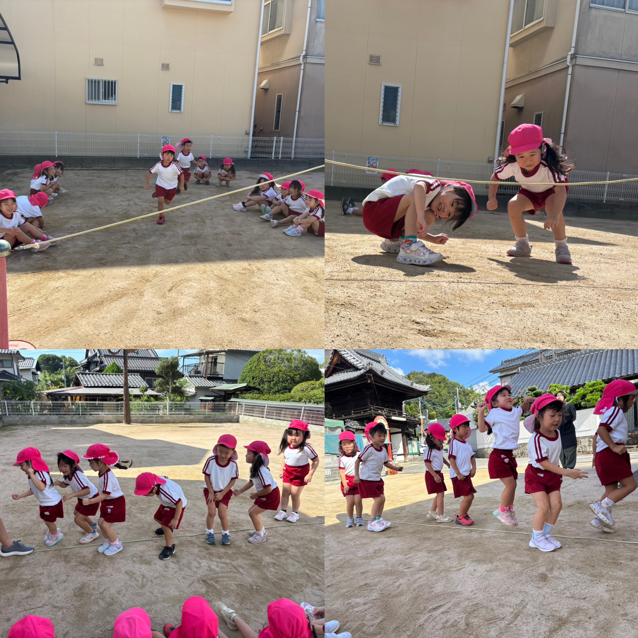 今日の体育指導は大縄跳びでした。久しぶりの縄跳び!まずは縄に当たらないように飛んだりくぐったりと楽しみ、これから少しずつ練習を重ねていきます!