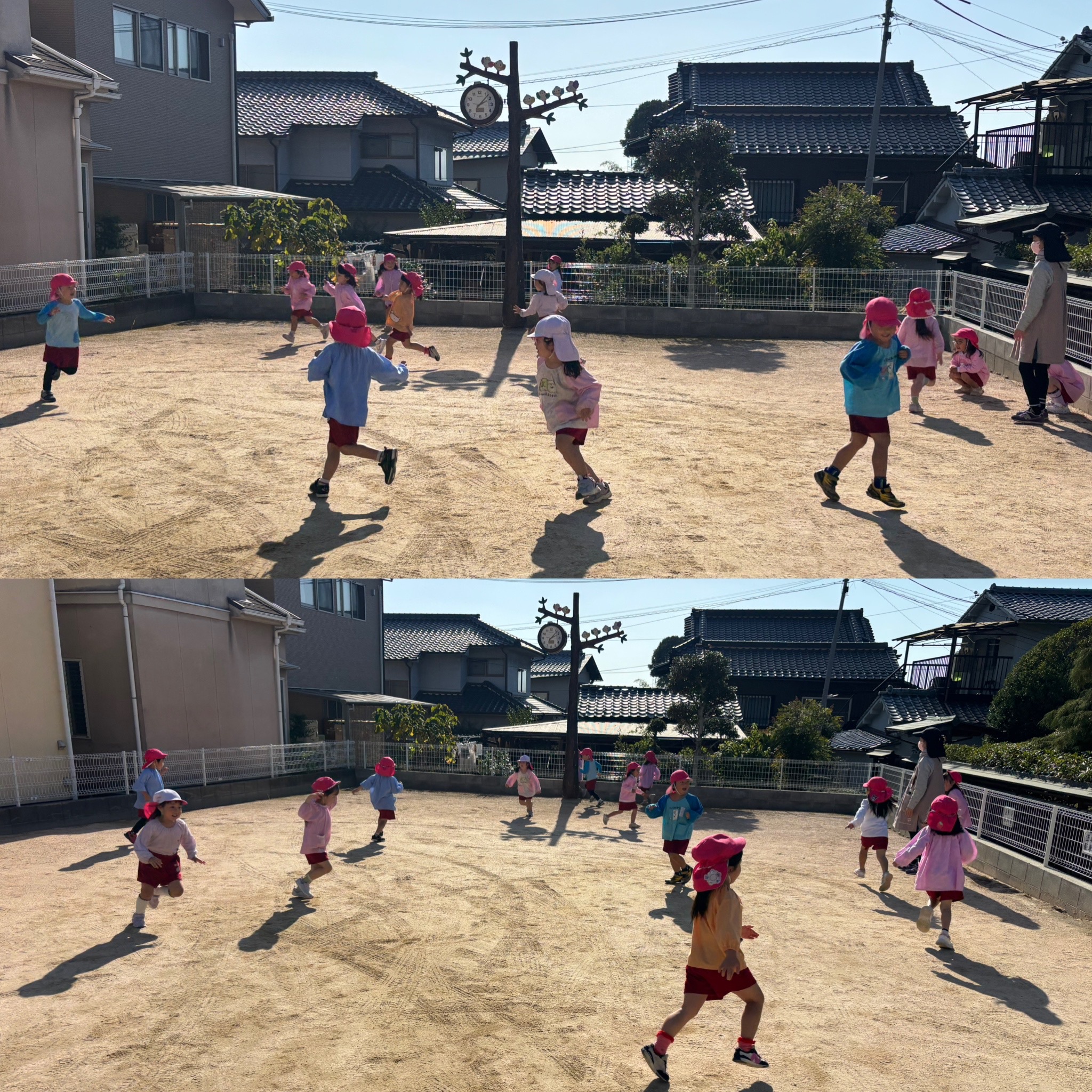 過ごしやすい日中。お外遊びの時間を少しのばして、広場でのみんな遊びを楽しんでいます。大人気はやっぱり鬼ごっこ!バナナ鬼ごっこや、増え鬼ごっこにと盛り上がっています。