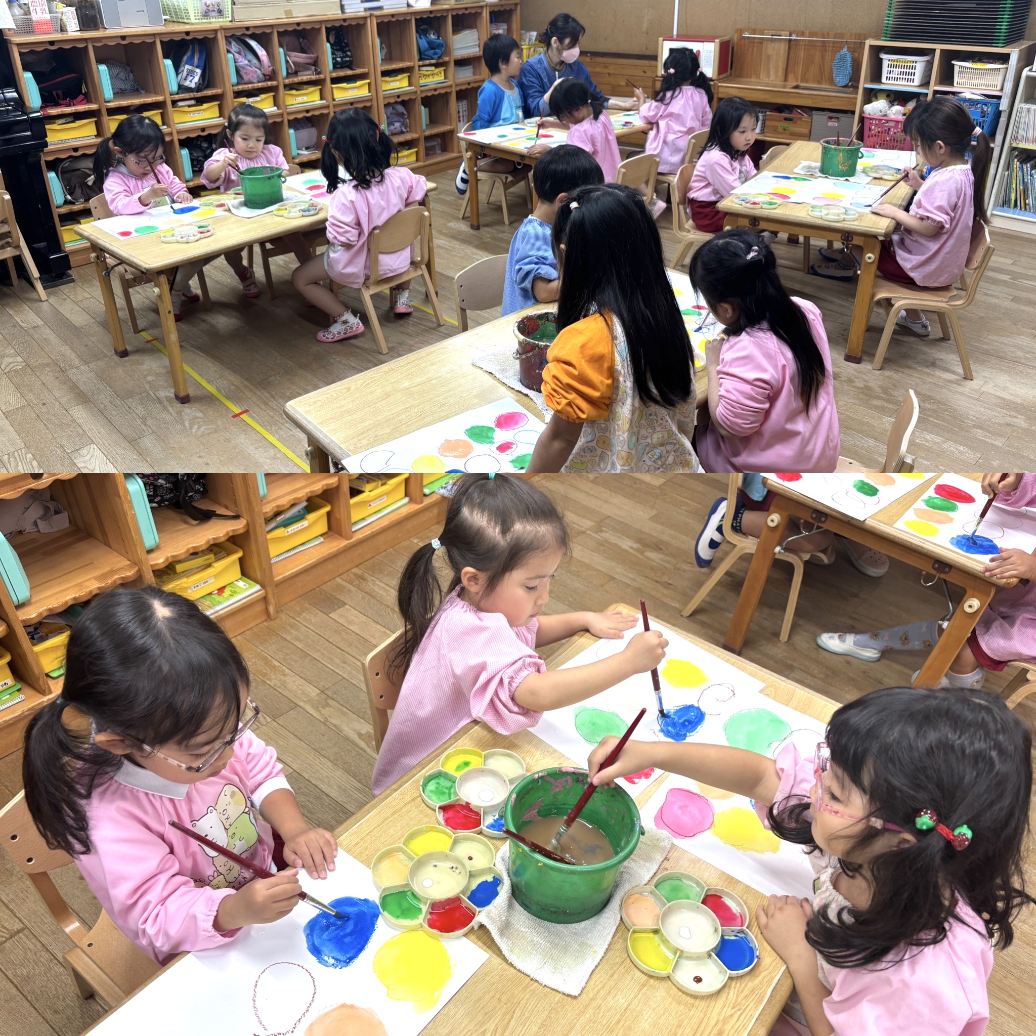 「できたら手はお膝!次のお話を聞きますよ!!」のお約束をして、今日は色混ぜ絵の具遊びをしました。何色になるかをみんなで予想しながら、、「わぁ大好きなピンクになった〜!」「次は次は!?」と、みんなの笑顔がはじけました!お片付けまでしっかり自分たちで行った子どもたちです。次回は自由に好きなだけ混ぜ混ぜタイムで絵の具遊びを楽しみたいと思います。