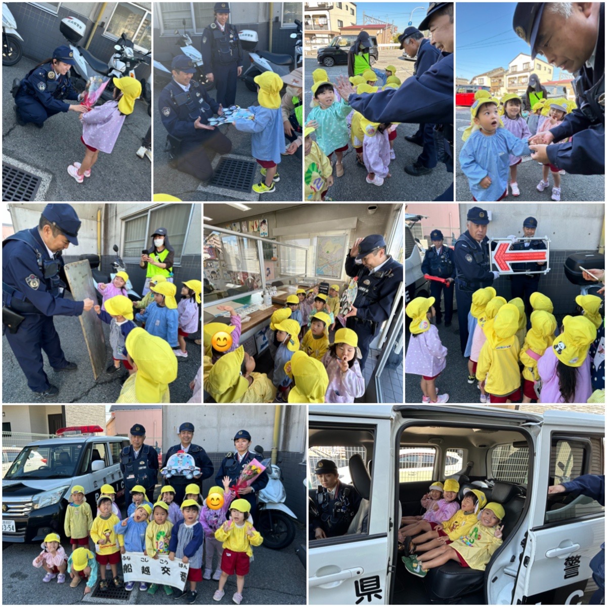 もうすぐ勤労感謝の日ということで、黄組さんは船越交番へ感謝の気持ちを届けに行って来ました。子どもたちの姿が見えると踏切を渡る前から、皆さんで優しく出迎えて下さいました。交番の中や、お仕事で使ういろいろな道具を見せてもらったり、使い方などを教えて頂きました。なんといっても、パトカーに乗せてもらえたことが嬉しかったようです!子どもたちの疑問に丁寧に応えてくださり、ありがとうございました。『大きくなったらおまわりさんになりたい人〜?』の質問に『はーい!』とたくさん手があがりました!