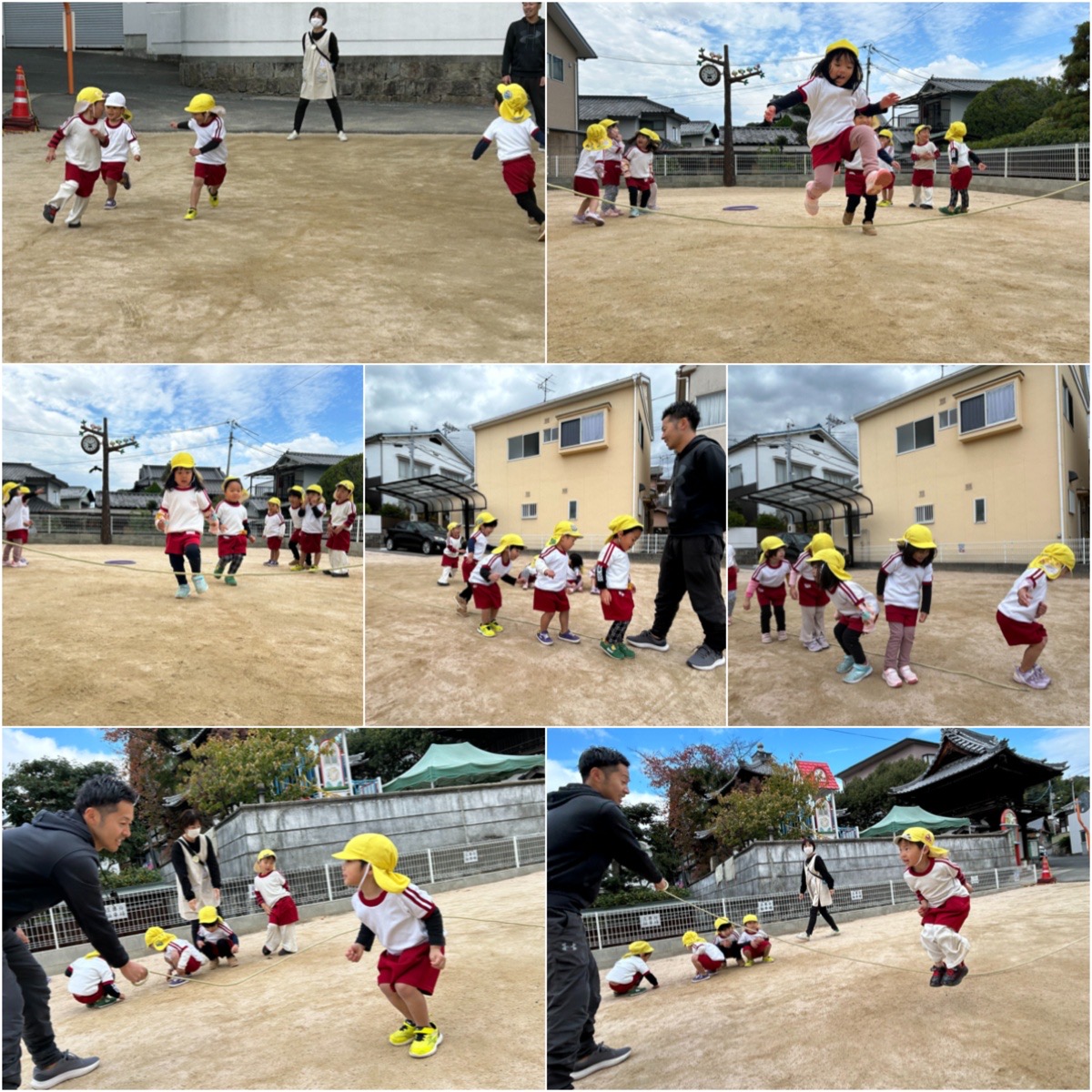 長縄ではどうしても縄と向き合って跳んでしまう黄組さん。山中先生からのアドバイス!『山中先生のお顔を見て跳んでみて』足元が気になりながらも、一生懸命お顔を上げて頑張っていました!!