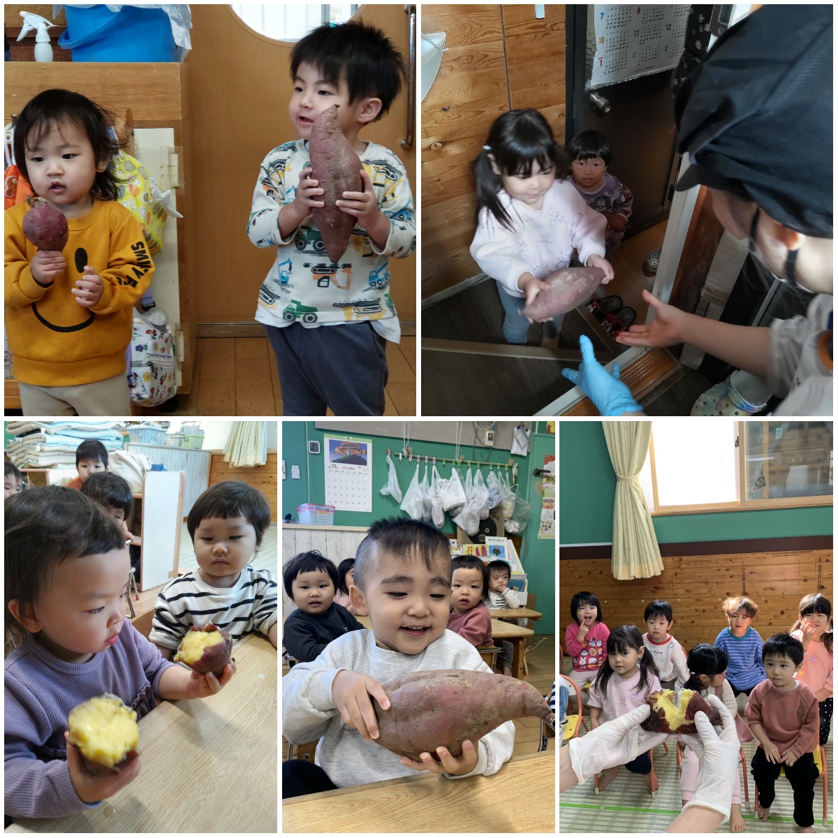 地域の人からさつまいもをいただき、みんなで持ったり、歌を歌ったりして楽しんだ後、給食先生にふかしてもらいました。「甘くておいしかったー」