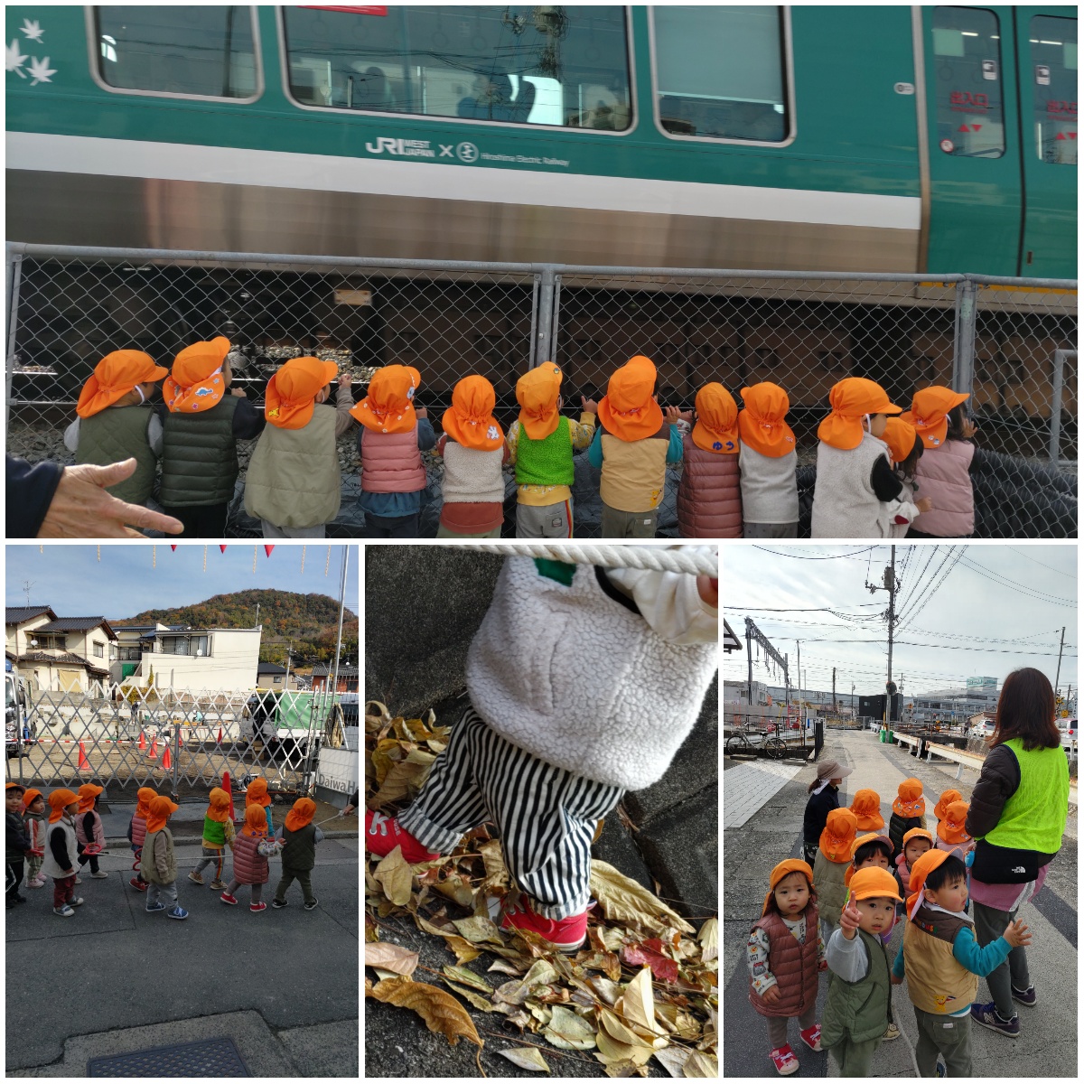 横断歩道を通ったり、工事を見たり、枯れ葉がたくさん落ちている山道を通ったり、電車を見たり!