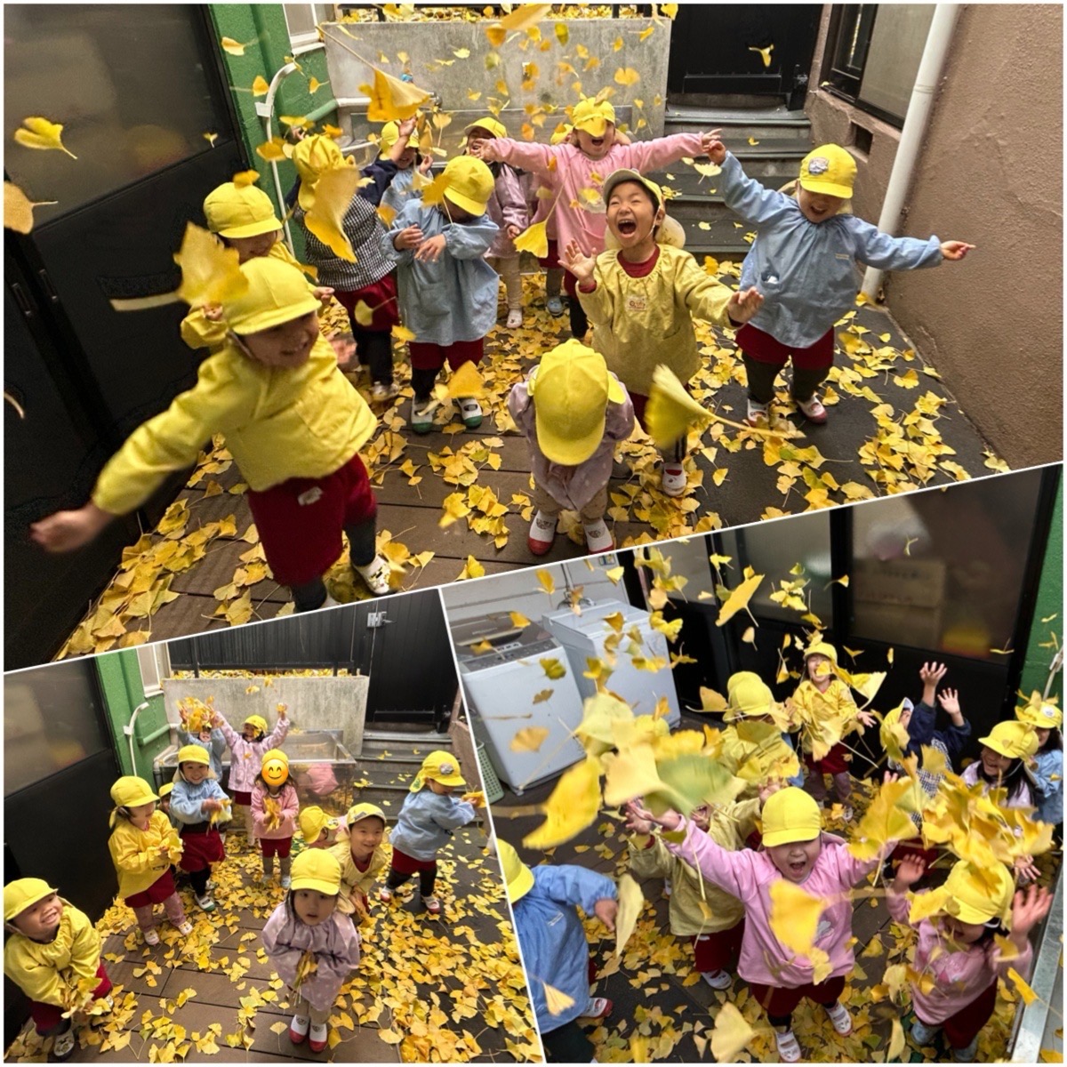お日様があたると暖かったですが、時々、ヒュ〜と冷たい風が吹いた1日でした。黄組の部屋の前も風に吹かれて落ちた銀杏の葉がたくさん。みんなで落ち葉で遊びました!最後はゴミ袋に入れるお手伝いをしてくれましたが、『なんで捨てるん?』ともったいない〜の子どもたちでした。お家に持って帰りたい!とビニール袋に詰めていました。