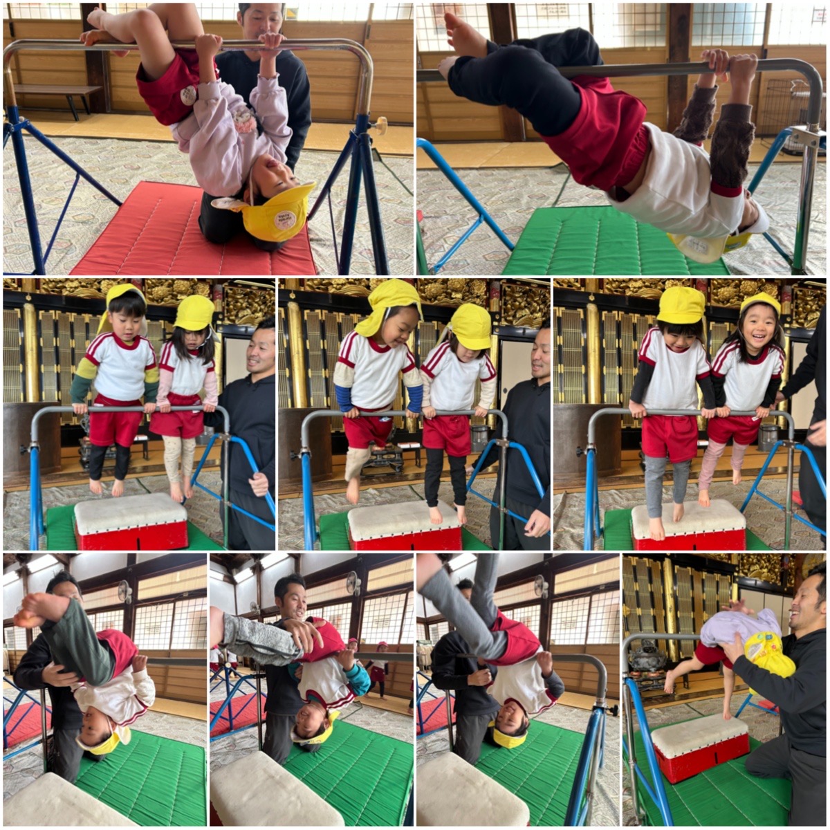 雨の為、室内で鉄棒を楽しみました。豚の丸焼き、足抜きまわり、前まわりに挑戦です!