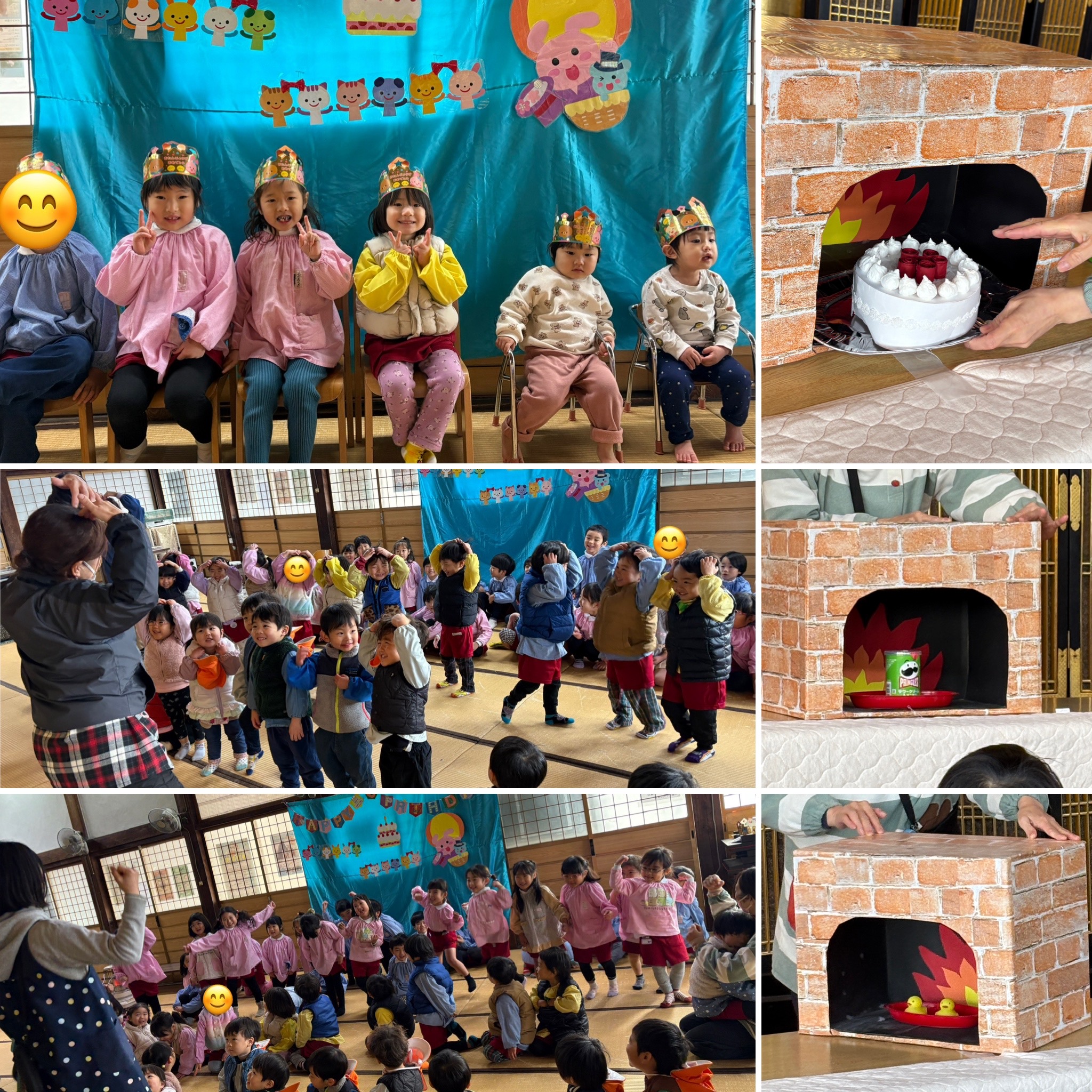 今日は朝から雪がチラチラ、子どもたちは嬉しそうでした!そんな中、1月のお誕生児さんのお祝いをしましたよ♪まずは体が温まるように先生の真似っこあそびをして大笑いしました。先生の出し物は不思議な石窯で色々なものが焼かれて…。卵がひよこに、じゃがいもはポテトチップに最後は誕生児さんのケーキが登場して大喜びでした!1月生まれさんおめでとう!