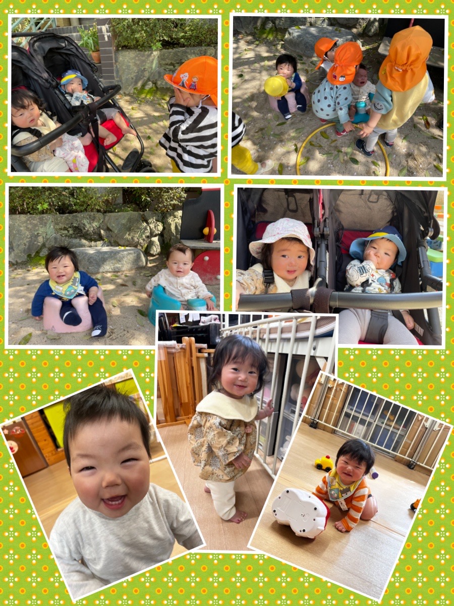 ポカポカ陽気の中、日向ぼっこ♪ 園庭に出ると、大きいクラスのお友達が「いないいない ばぁ」たくさんあやしてくれます☺︎
