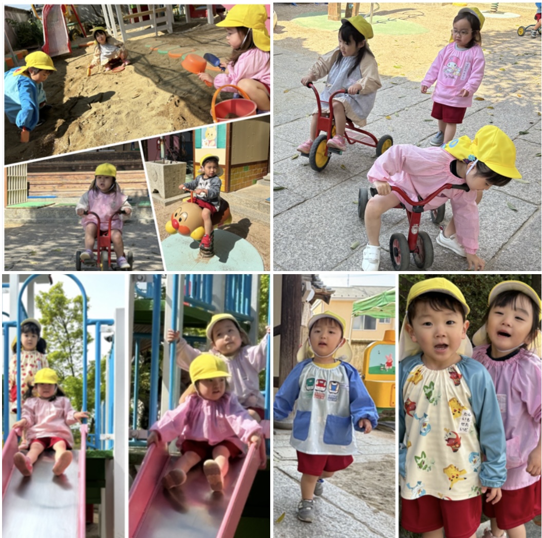 進級して2週間です。 園庭遊びが大好きな黄組さんたちは、毎日「お外あそびに行きますよ〜」の声かけに大喜びです!! 三輪車に砂遊び、滑り台に花びら集めにと駆け回って楽しんでいます!