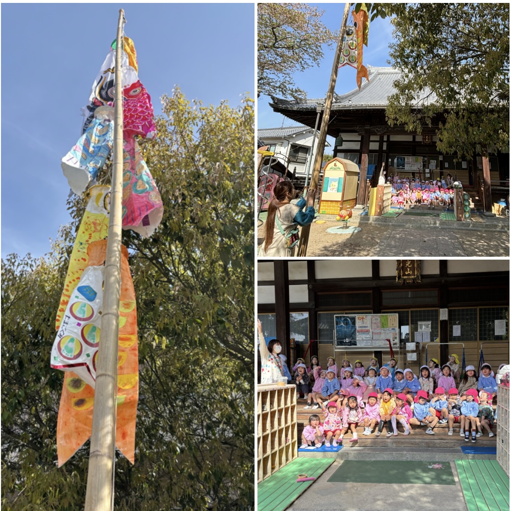 今日から、青空にクラスのこいのぼりが元気に泳ぎます! 泳ぎはじめの今日!!幼児組さんたちで上げられていくこいのぼりさんたちを拍手で見守りました!