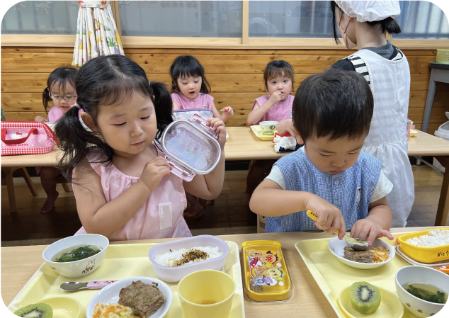 たのしい給食時間。しっかり遊んだ体に栄養をしっかりチャージします。