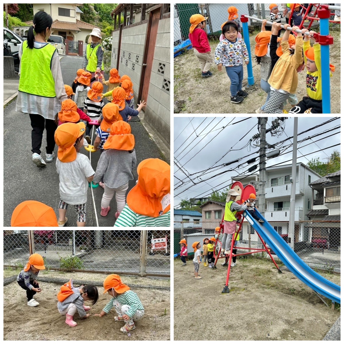今日は散歩綱を持って、近所の三角公園に行きました。道々もおしゃべりや歌を歌ったり賑やかです。お約束は綱から手を離さない。みんなちゃーんと出来ましたよ。 公園では、保育園の滑り台より少しスピードが出るのが楽しいようで大人気。 公園ばいばーい。また来るからねー。と帰りました。