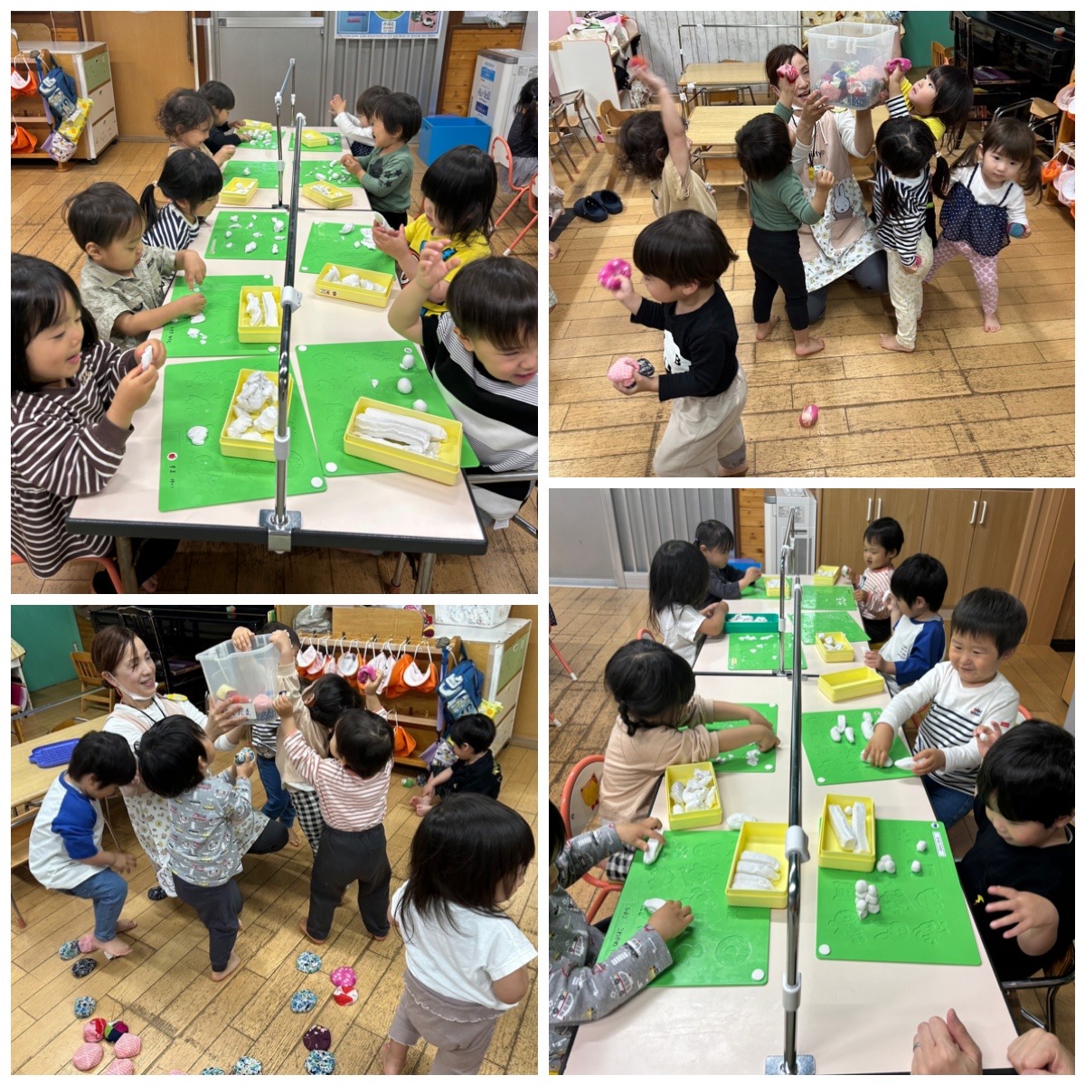 今日は、晴れ曇り雨ざーざー風がひゅ〜の天気体操の雨の日!!外に行けません。 でも、雨の日のお助けアイテム。大好きな粘土と運動会練習の玉入れをして楽しみました。実はお手玉なんですけどね笑。