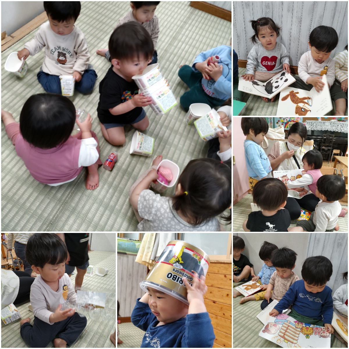 雨の日は、お部屋の中で過ごす遊びに飽きてしまうと、子どもたちの気分も雨模様。 廃品も子どもたちの良いおもちゃに! 絵本は見たりめくったりと楽しんでいます。