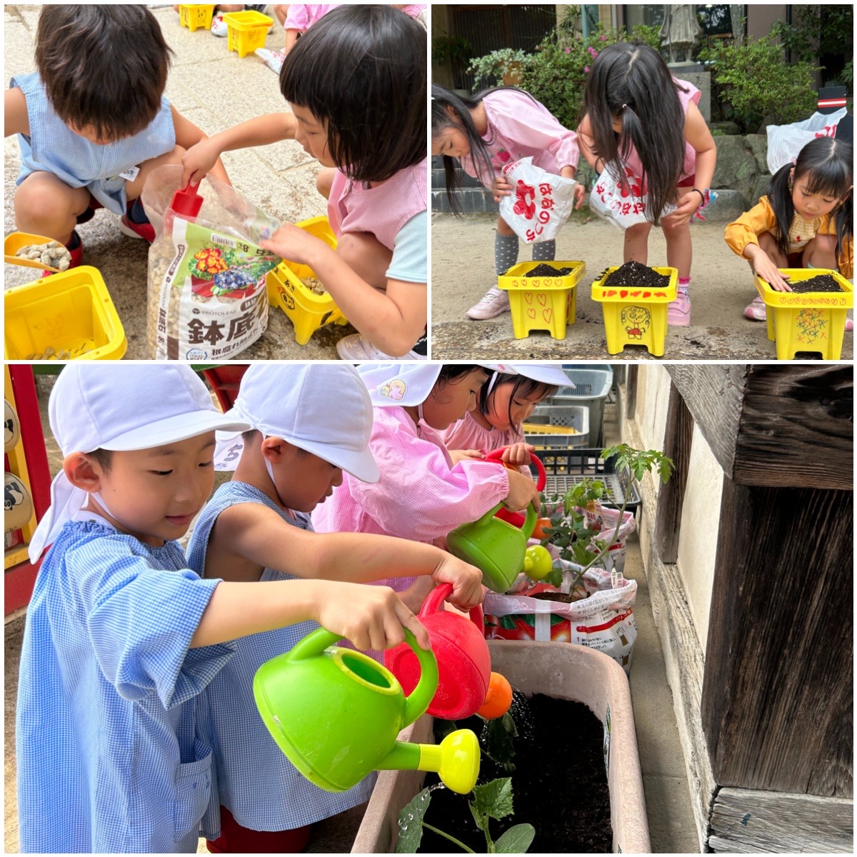 夏野菜の苗(トマト、キュウリ)、ひまわり、朝顔の種を植えました。お当番さんのお仕事に水やりが増えました。毎日観察しながら栽培を楽しみたいです!