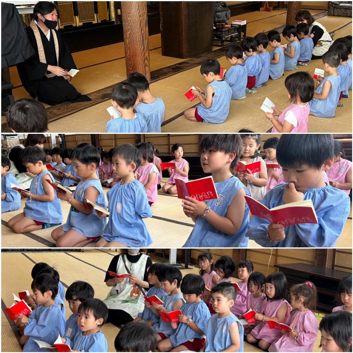 毎日、朝の体操の後には本堂に入り、手を合わせ礼拝を行っています。今日は進級して初めてのおつとめがありました。これから少しずつ、副園長先生にお経の読み方を教わっていきます。