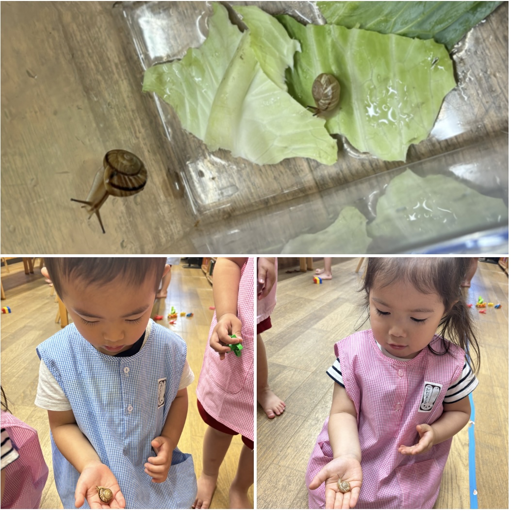 先週から黄組さんでも、カタツムリを飼い始めました。お当番さんにご飯をあげてもらったり、平気なお友達は手の平にのせて観察したりしています^_^ 日に日に名前がかわるカタツムリたち! ちなみに今日は、『でっかいちゃん』と『ちびちゃん』でした(笑)