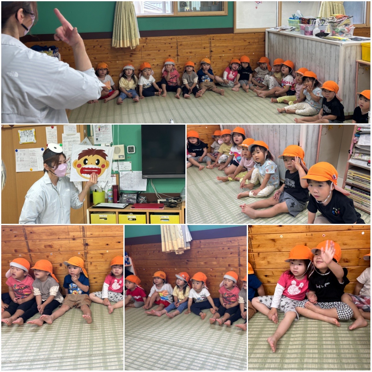 今日は虫歯予防デー。歯医者に扮したゆみ先生がペープサートで歯磨きしなかったら虫バイキンが来るお話しをしてくれました。みんな真剣に聞いていましたよ。先日の歯科検診を思い出したのか、ちょっぴり涙が出たお友達の手をつないで、励ましている姿もありましたよ。 今日はママと歯磨き頑張るぞ!ってみんな言ってました。