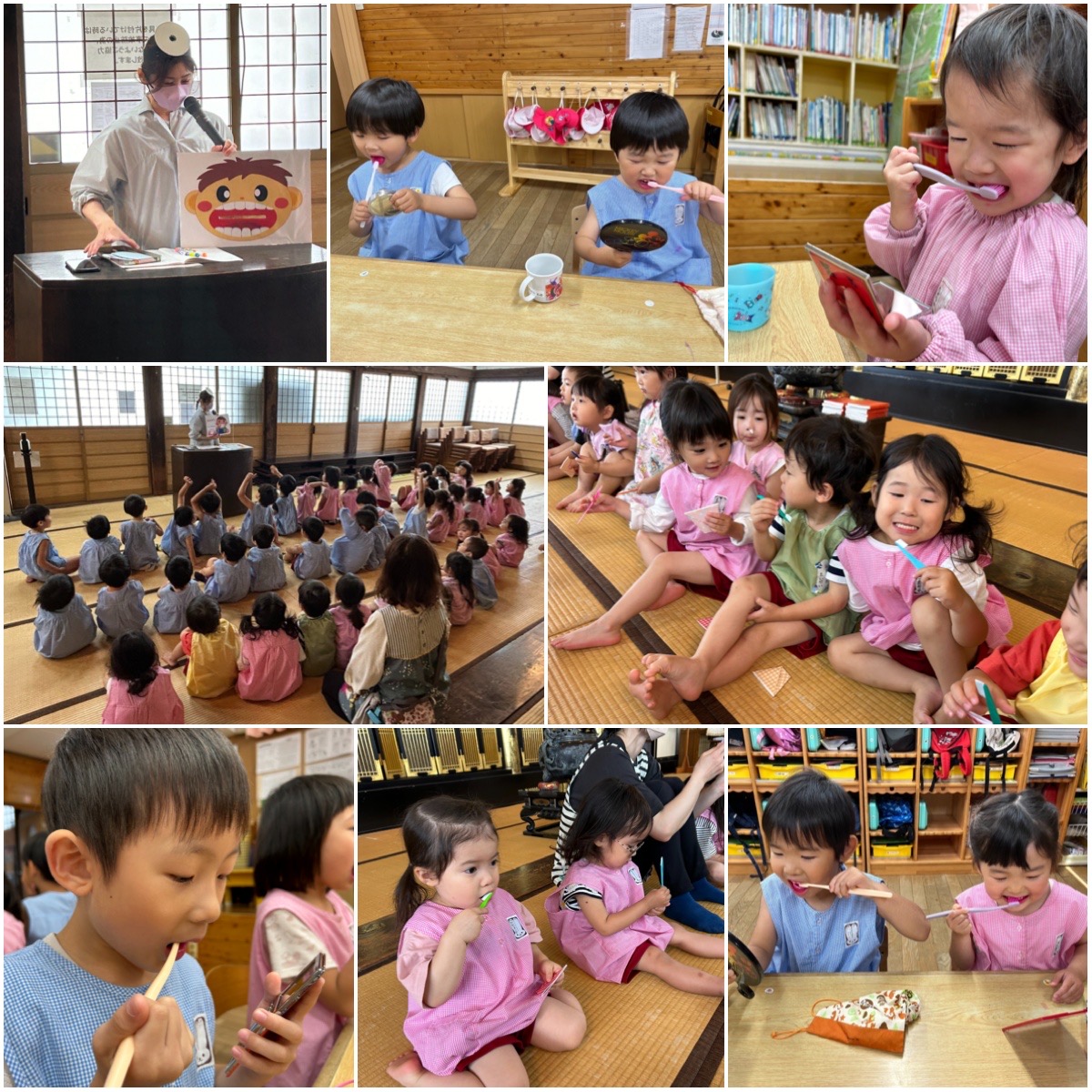 今日は虫歯予防デーでした。歯のしくみや歯の名前、歯のみがき方を教わりました。黄組さんは、折り紙の歯ブラシで練習しましたよ。桃組、白組さんはプラークチェッカーをしました。手鏡で自分のみがき残しを確認しながら、歯ブラシでもう一度ブラッシングしました。今日はみんな、教わったことを思い出しながら夜の歯みがきをしてみてくださいね!