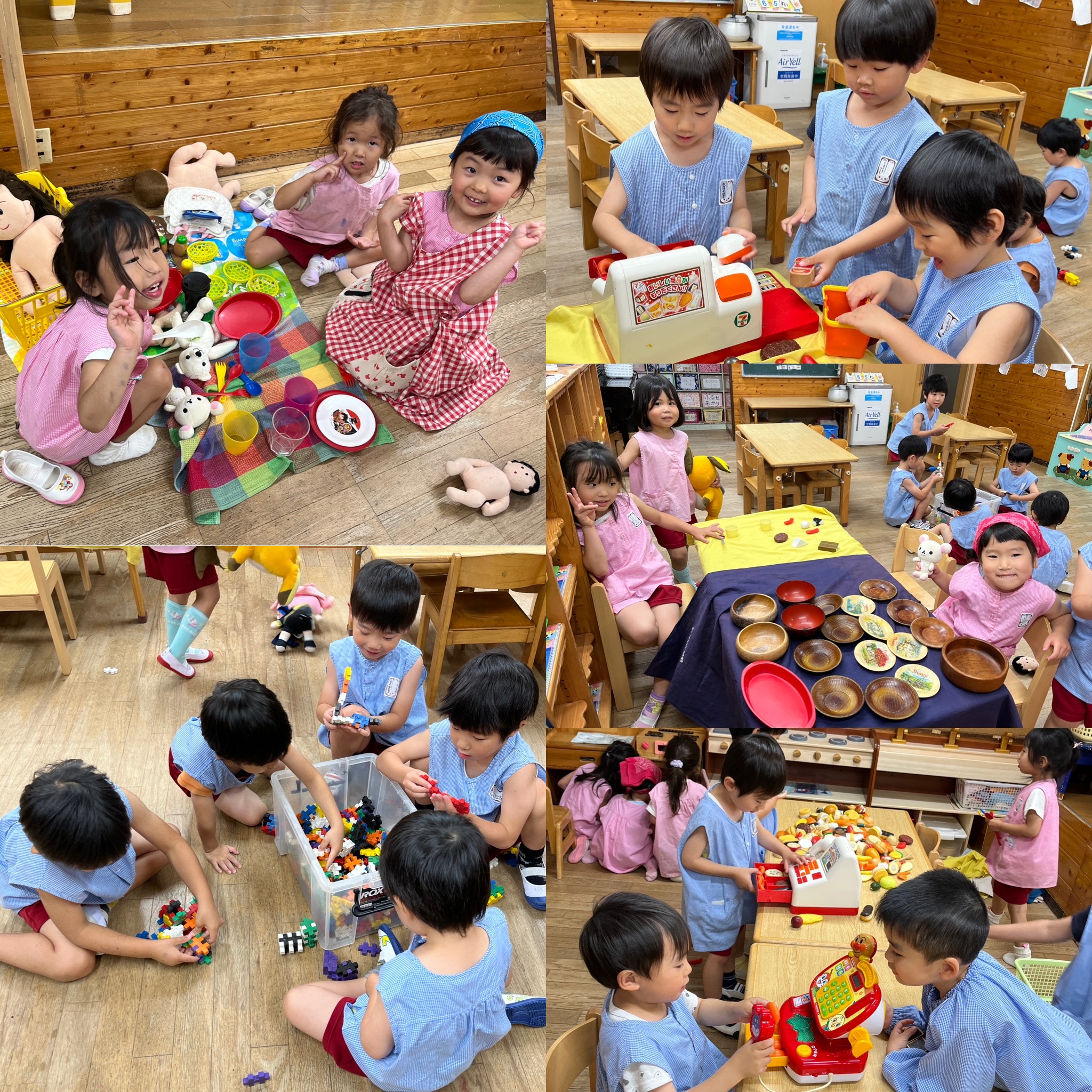 白組さんが消防署へ行ってる間、お部屋を借りて過ごしました。普段とは違うままごとやブロックに目をキラキラさせて楽しそうに遊んでいましたよ! 白組さんありがとう☆