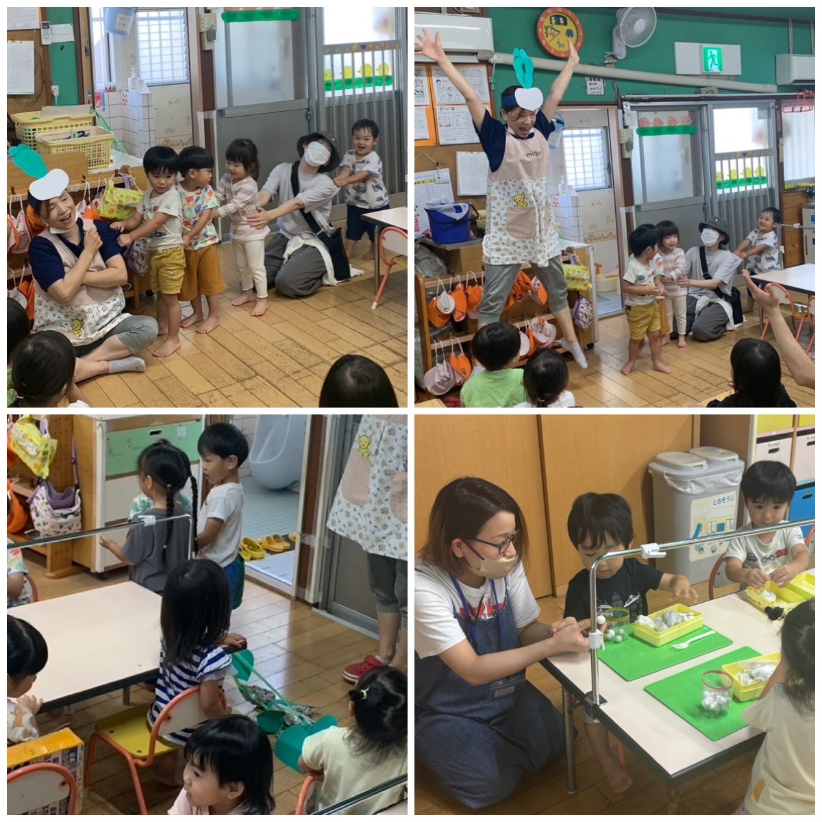 今日は参観日でした。 おうちの方が部屋まできてくださるなんて!嬉しくて涙も出ますよねー笑。朝のお集まりでは楽しく劇ごっこも見てもらえました。水あそびでは子どもたちに水をかけられたママごめんなさい。粘土あそびでは一緒におだんご作りありがとうございました。 明日も続きます。日頃の様子を見にきてくださいね。