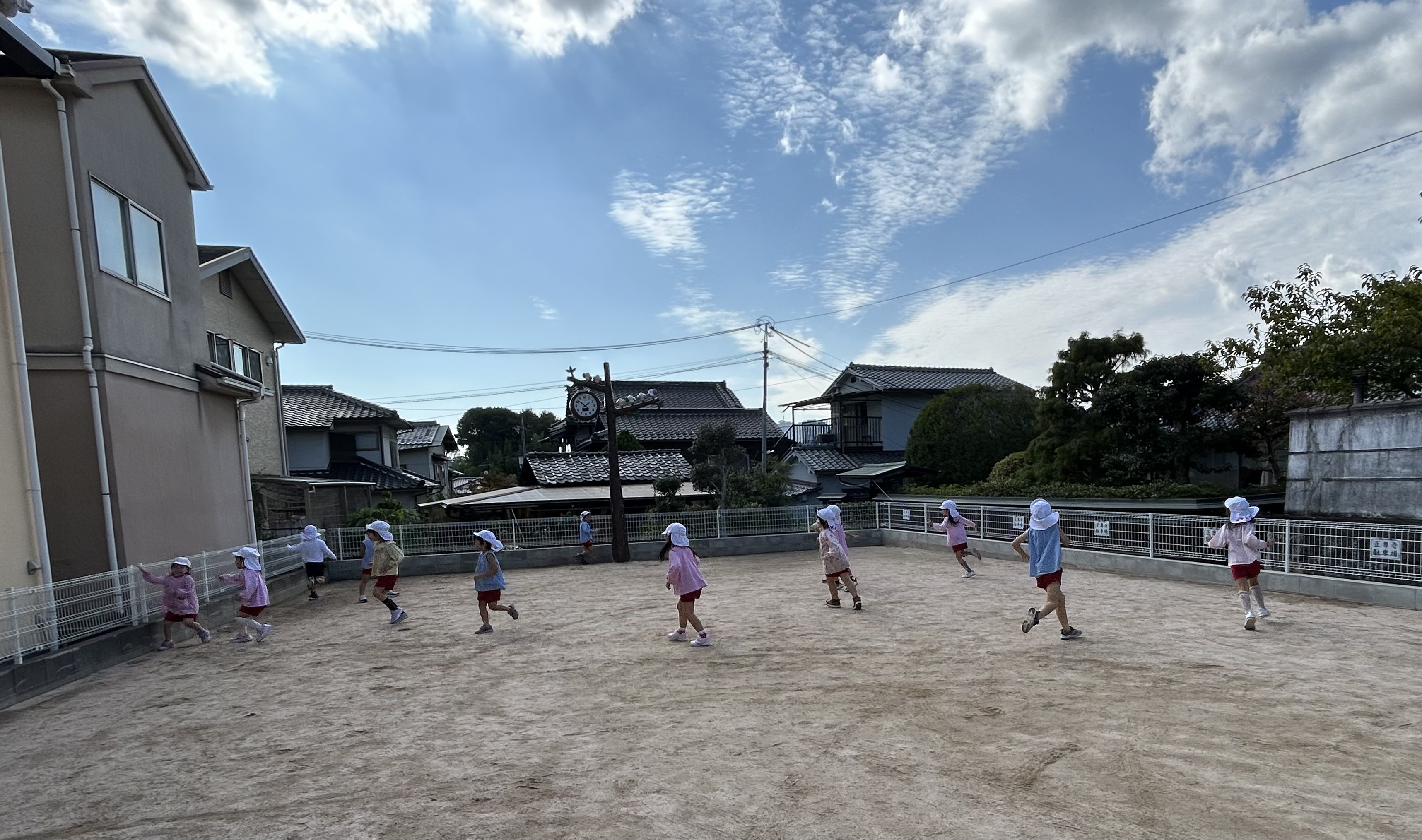 とにかく体を動かして遊ぶのが大好きな白組です。最近は、『今日も広場行ける?』『早く給食を食べて広場行こうや〜』と、午後の室内あそびの時間を広場での時間へとあてています。みんなのやりたいことは一択!鬼ごっこです!最初はお当番さんが鬼です。途中から先生も鬼になって参加します!なかなか楽しい時間です♪