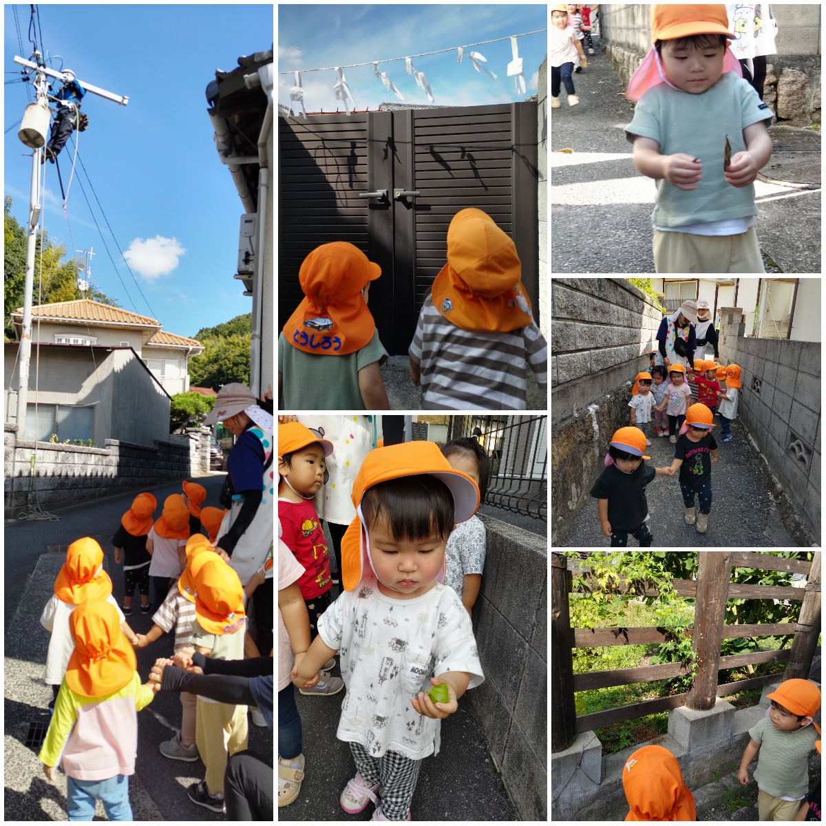園庭遊びの後、園付近を散歩します。 今日は電柱工事のおじさんに会いました。金木犀のかおりを楽しんだり、柿を見たり、葉っぱや石ころを拾ったり、祭りの紙垂飾りをみたり!! 中でもフウセンカズラは大人気です。