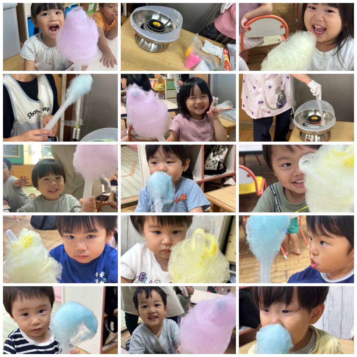 今日は作品展頑張んばったのご褒美に手作り綿菓子を食べました。 ふわふわ飴が出てきて丸くなっていくたびに歓声です。先生たちは形を整えるためにプレッシャー笑。 あまーい味に子どもたちはあまーい笑顔。 楽しいひと時になりました。27名写真を載せれずごめんなさい!!みんな笑顔でしたよ。