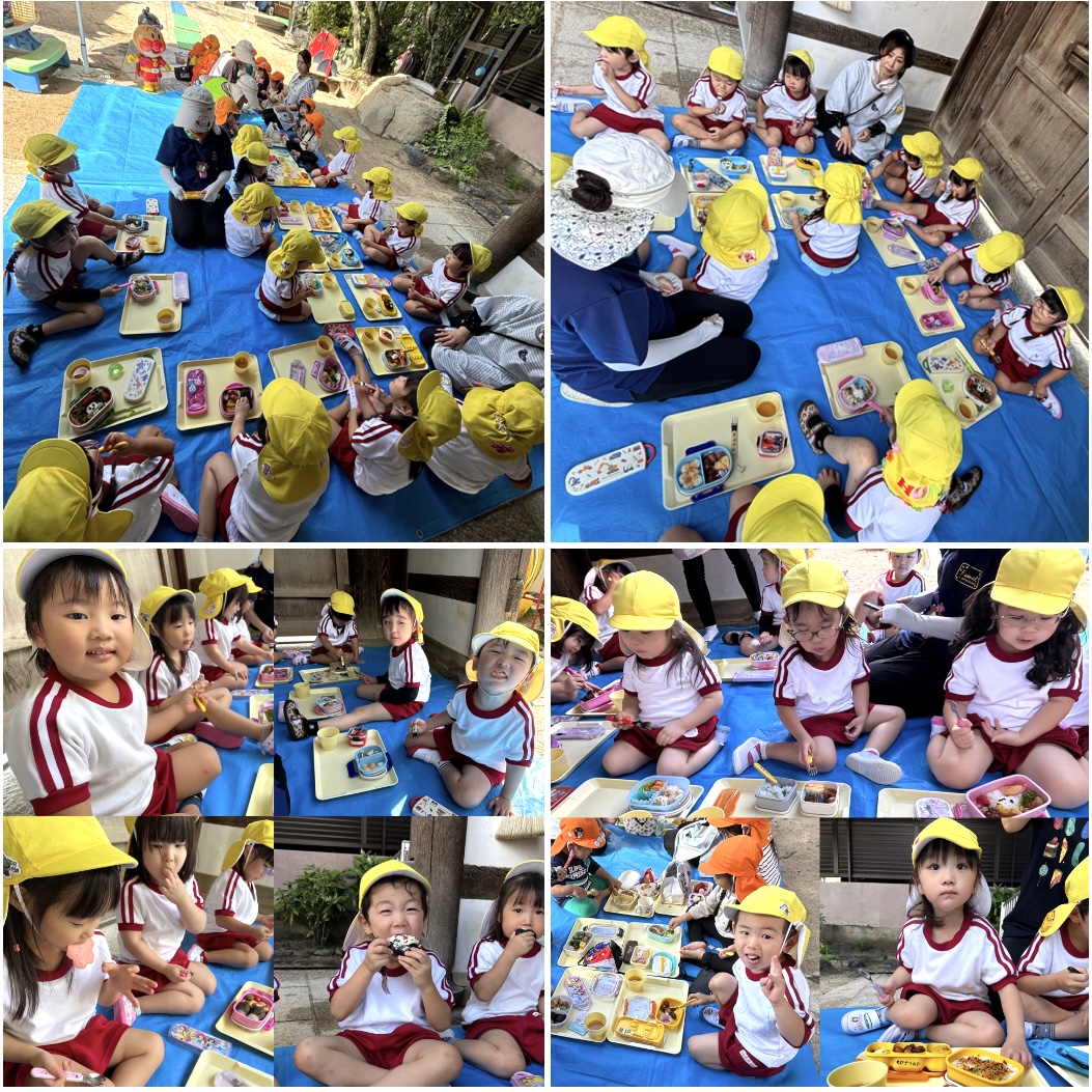 岩滝山で落ち葉やどんぐりを拾い、おやつのせんべいとカルピスを飲んだら保育園へ帰園です!そして、待ちに待ったお弁当タイムに突入!園庭に大きなシートを敷き、風を感じながら食べました。みんな作ってもらったお弁当を嬉しそうに見せてくれ笑顔いっぱいの素敵な時間となりました。