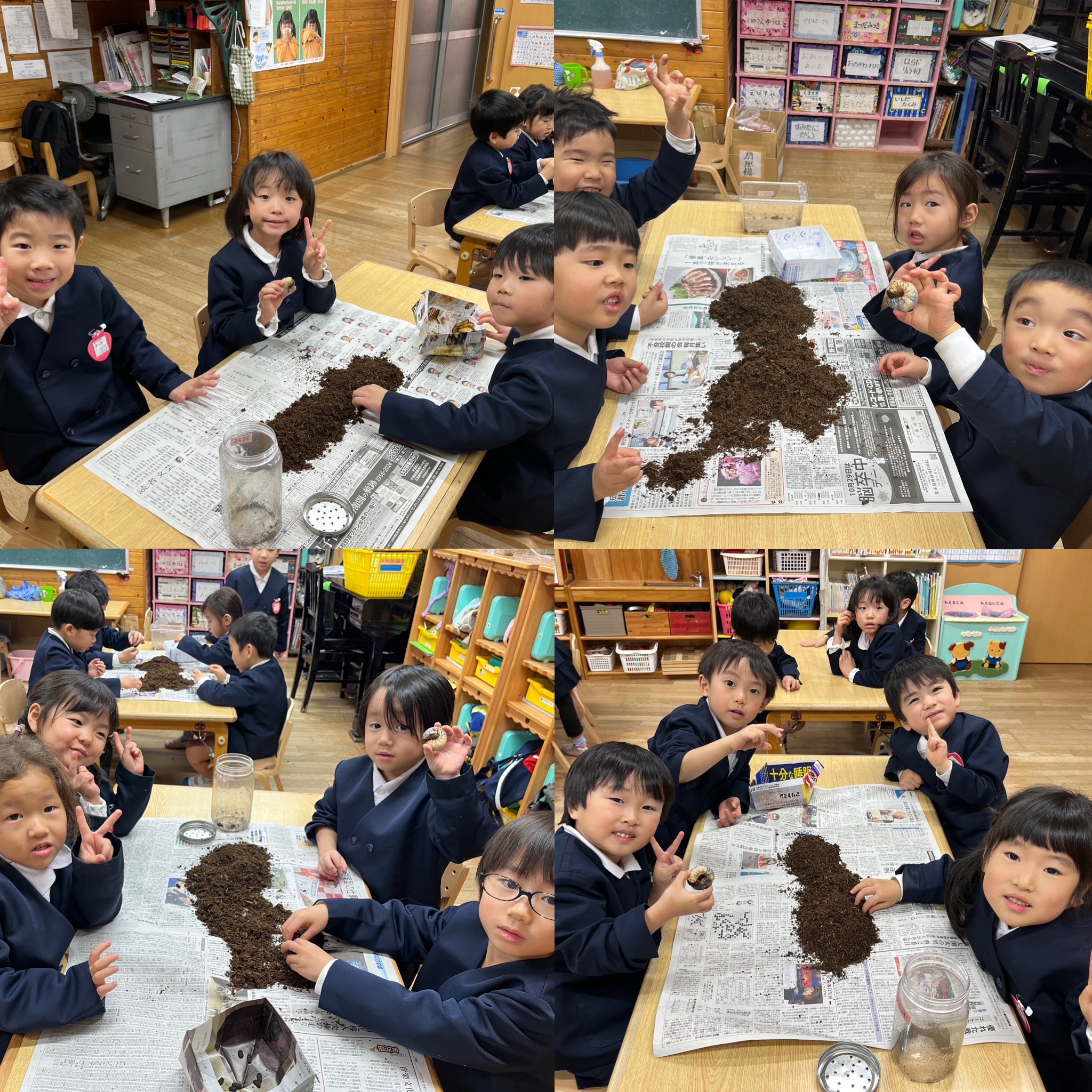 夏に飼っていたカブトムシの卵が幼虫になっています。日に日に大きくなる幼虫を触ったり、うんちを取ったりとお世話しながら可愛がっていますよ!