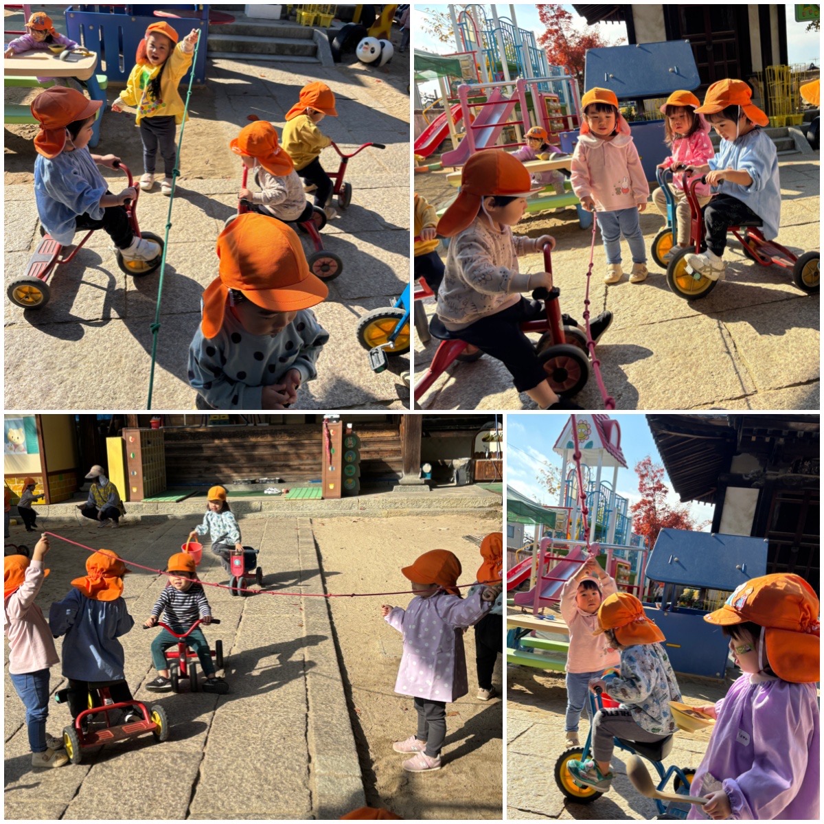 今日は気持ちいい気候で、園庭も賑やかでした。縄跳びで踏切を作る!と始まれば、カンカンカンの声で子どもたちが集まってきます。どーぞ。通ってくださーい。の合図で横断します。かわいいですね。
