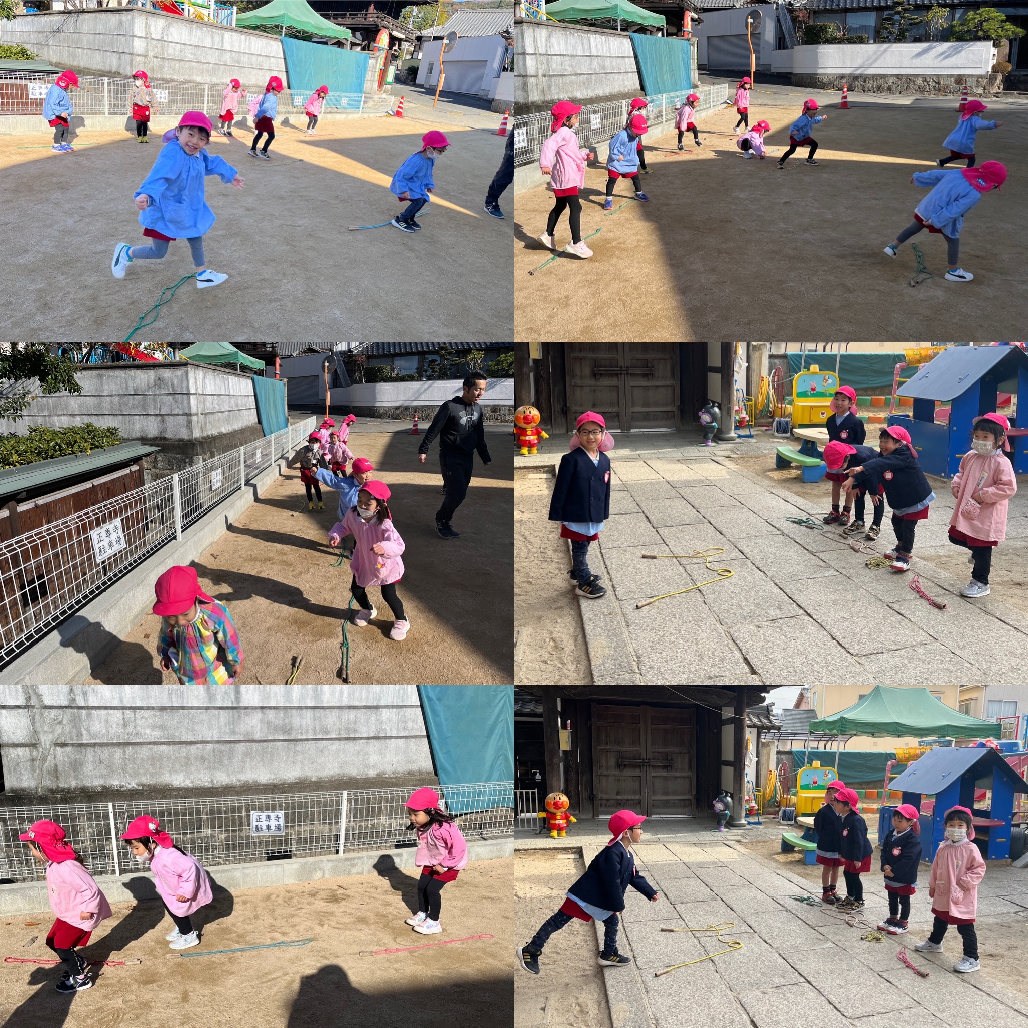 昨日の体育指導で習った縄跳びを園庭遊び中に練習してると「体育指導ごっこしようやぁ」と声が聞こえ…お友達が先生になっておはようございますのご挨拶から始めていました!
