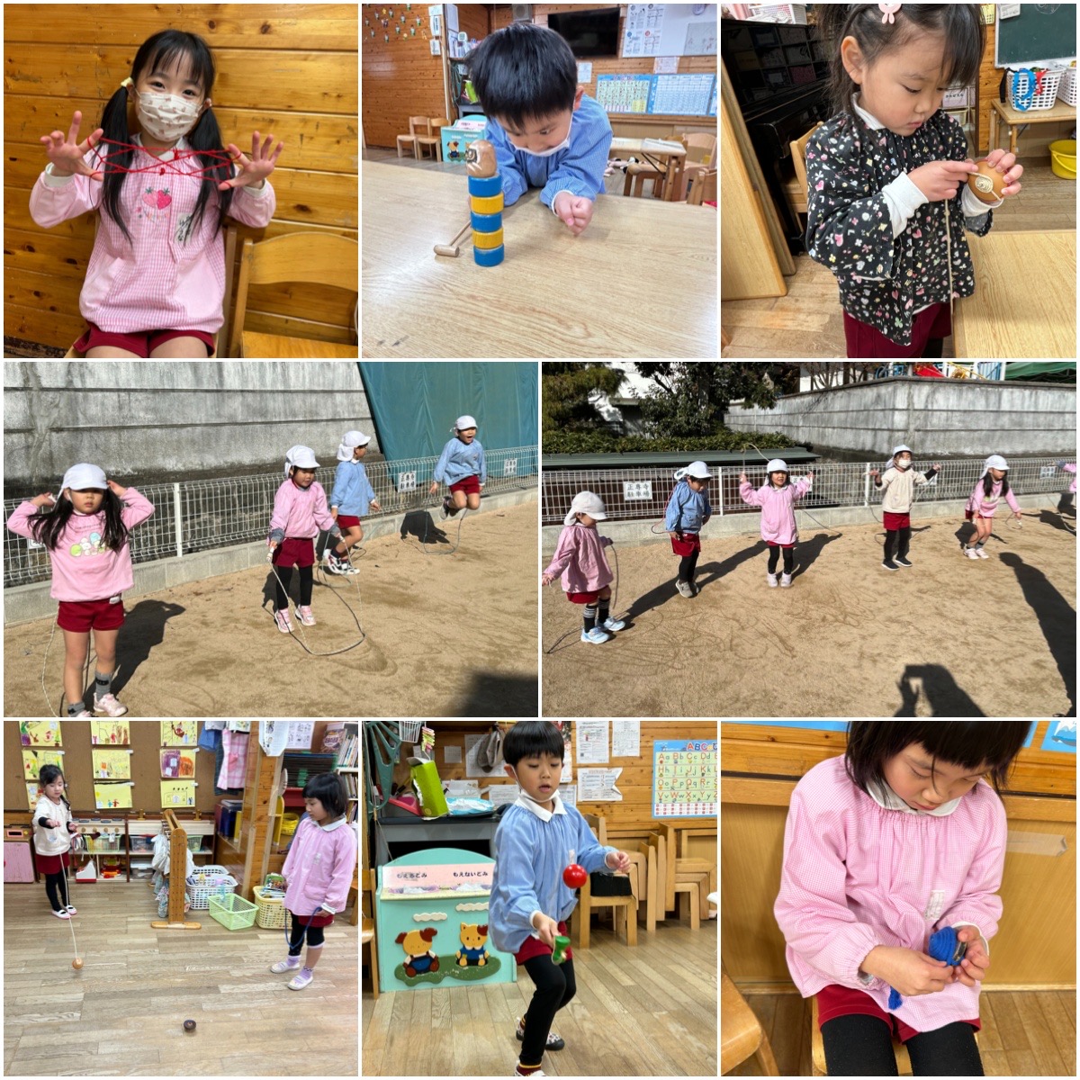 冬の遊びに夢中になっています。縄跳び、あやとり、こまやけん玉、だるまおとしなど、どれも習得するには根気が必要なものばかりですが、お友だちと教えあったり、競い合ったりしながら楽しんでいます。