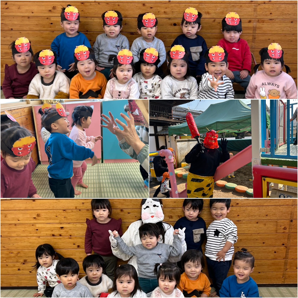 今日は、鬼面をつけて豆まきを楽しみました。 園庭に現れた鬼は強そうだったので、皆警戒してましたよ。福の神は親しみやすさを感じたのか近寄っていました。沢山の福が訪れますように!